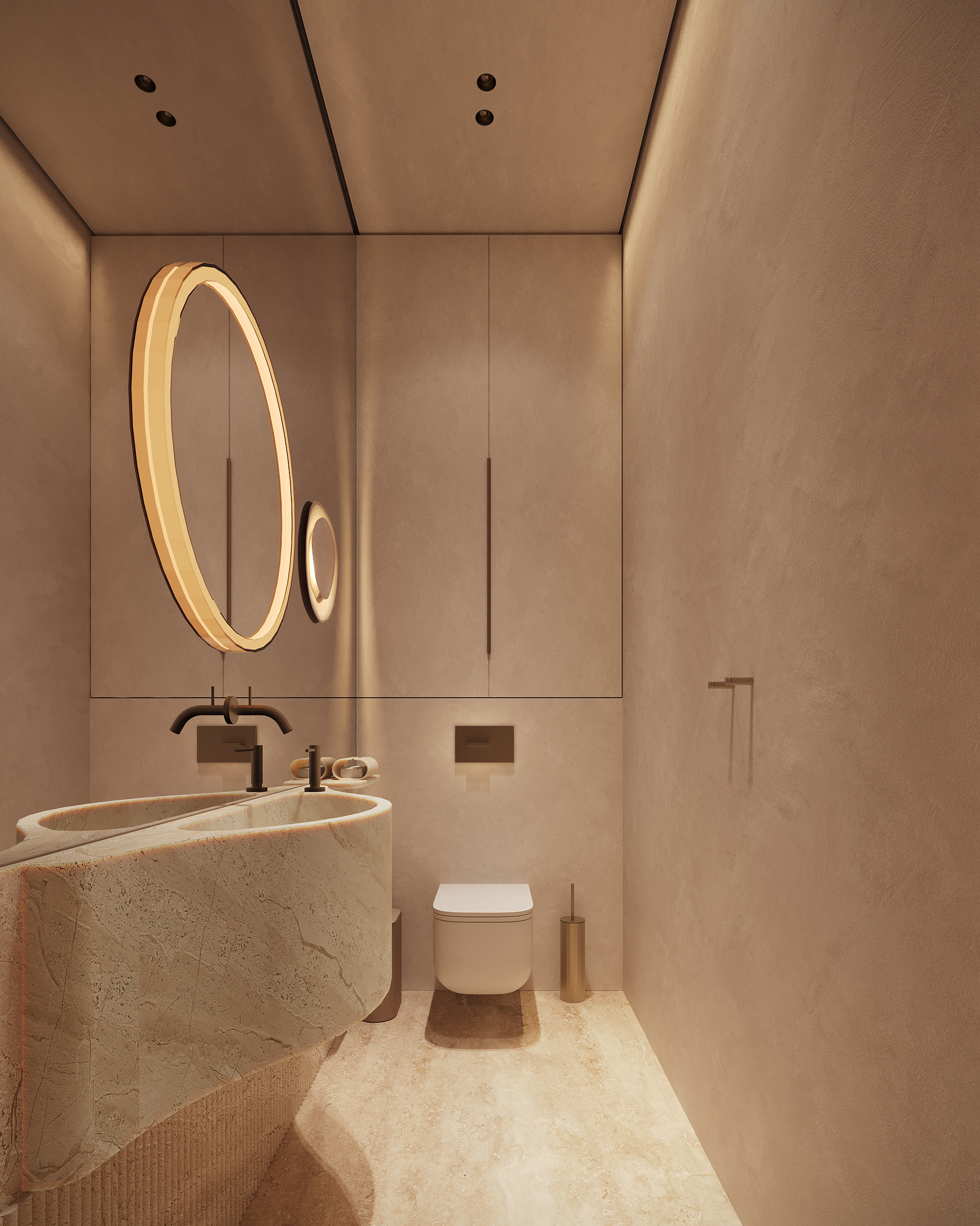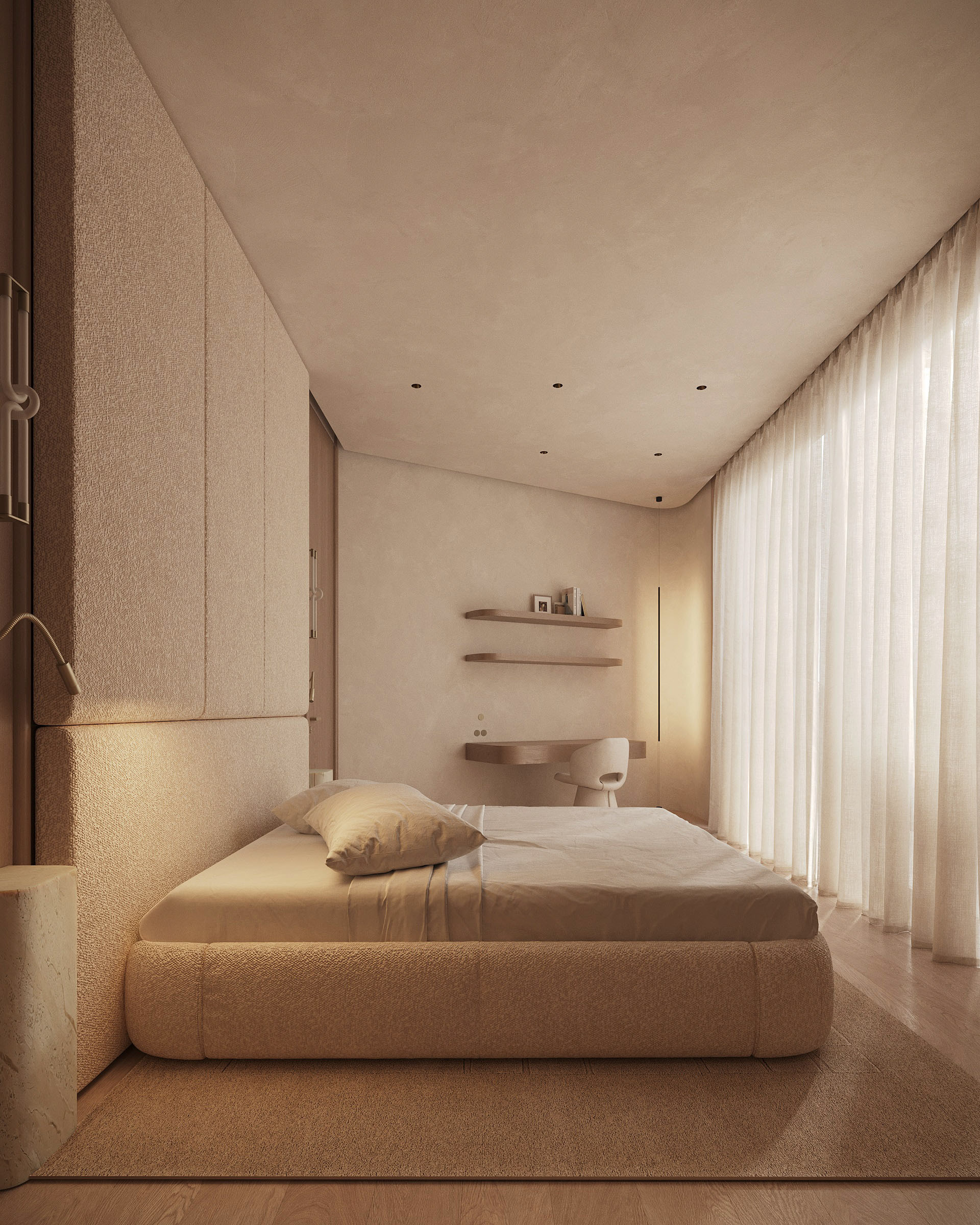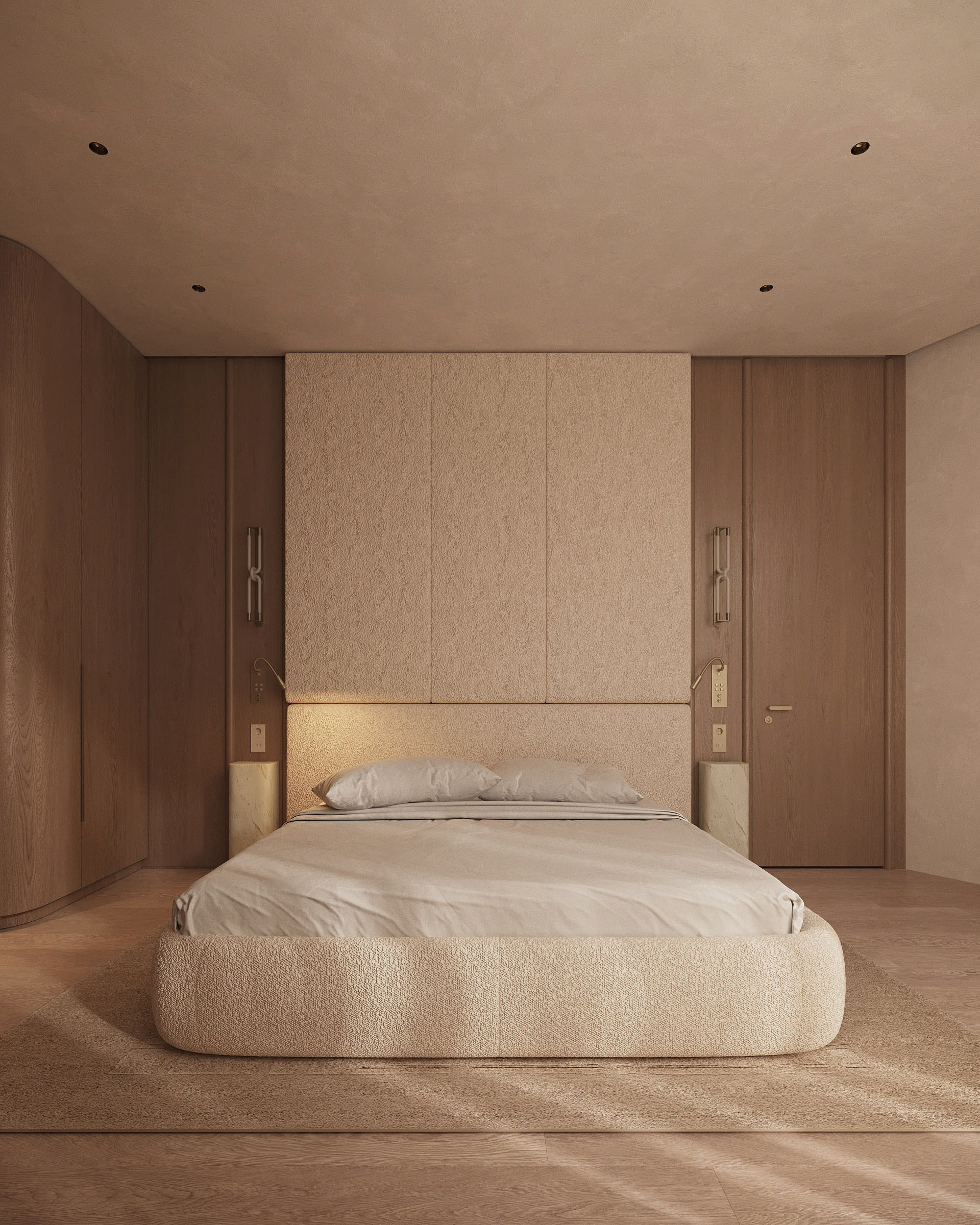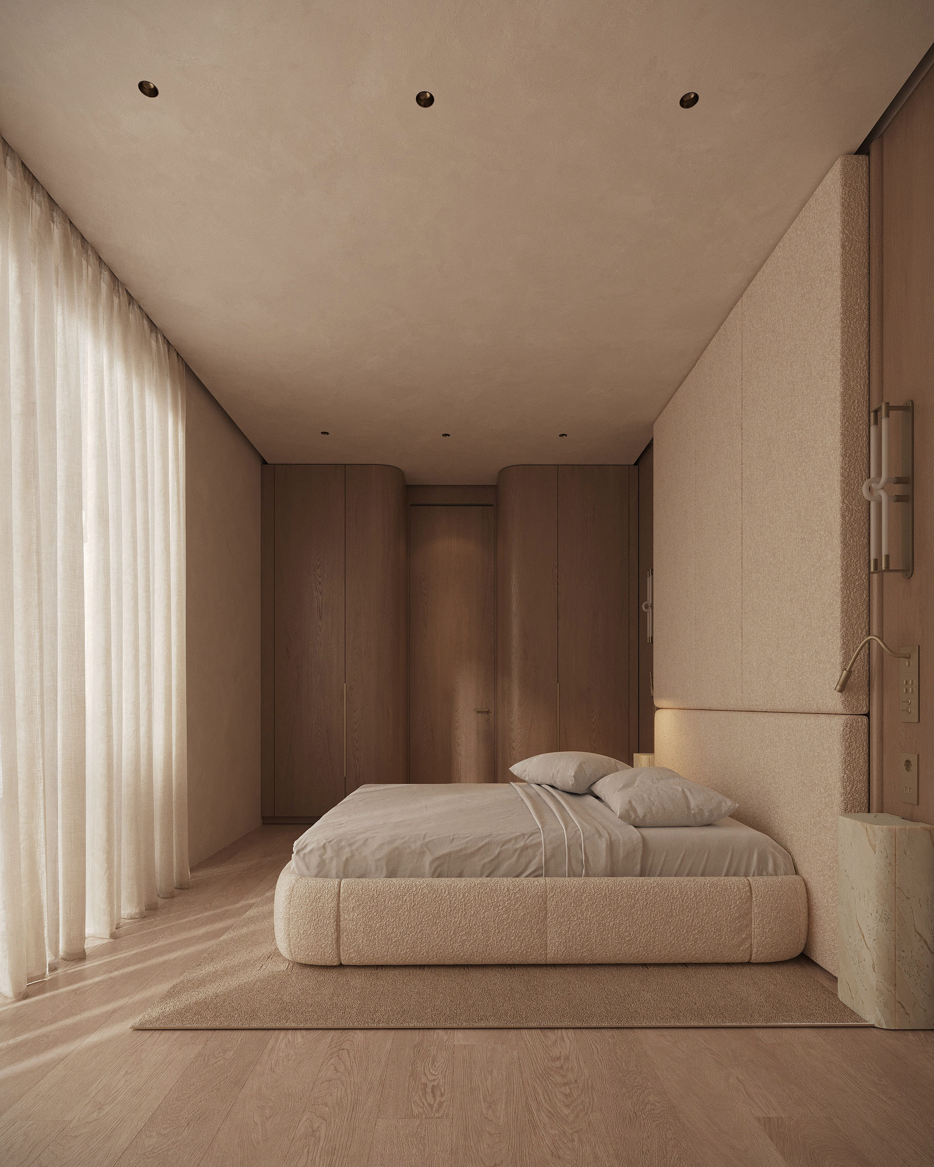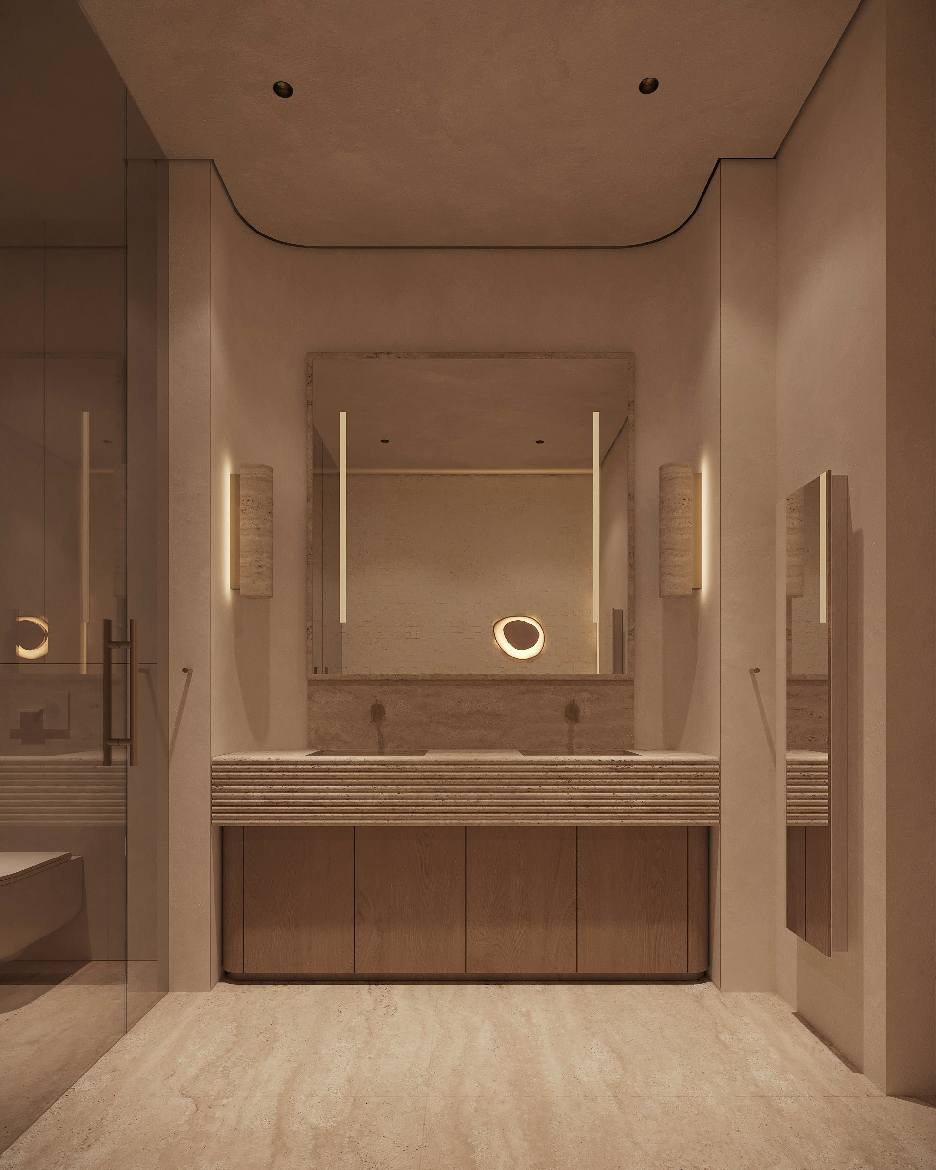 Material Extension: We have utilized a consistent palette of sculptural travertine, warm timber, and earthy micro-cement. By carrying these textures from the core of the master suite out onto the terraces, the eye perceives the entire area as one expansive, unified environment.
