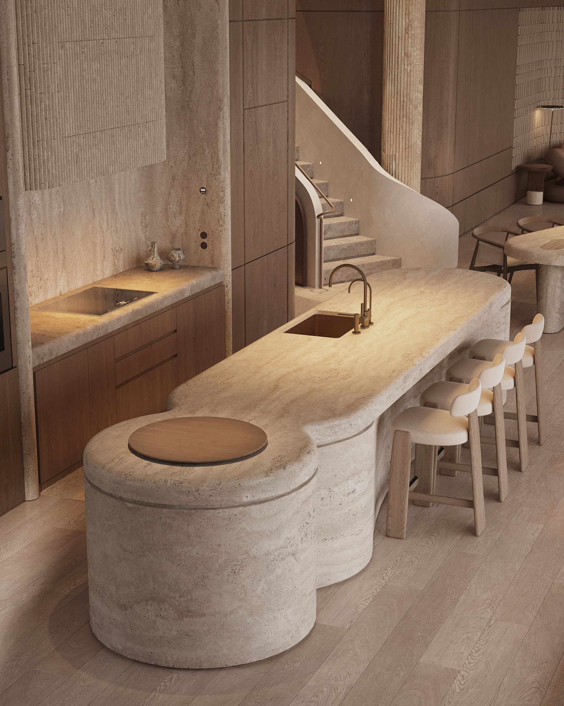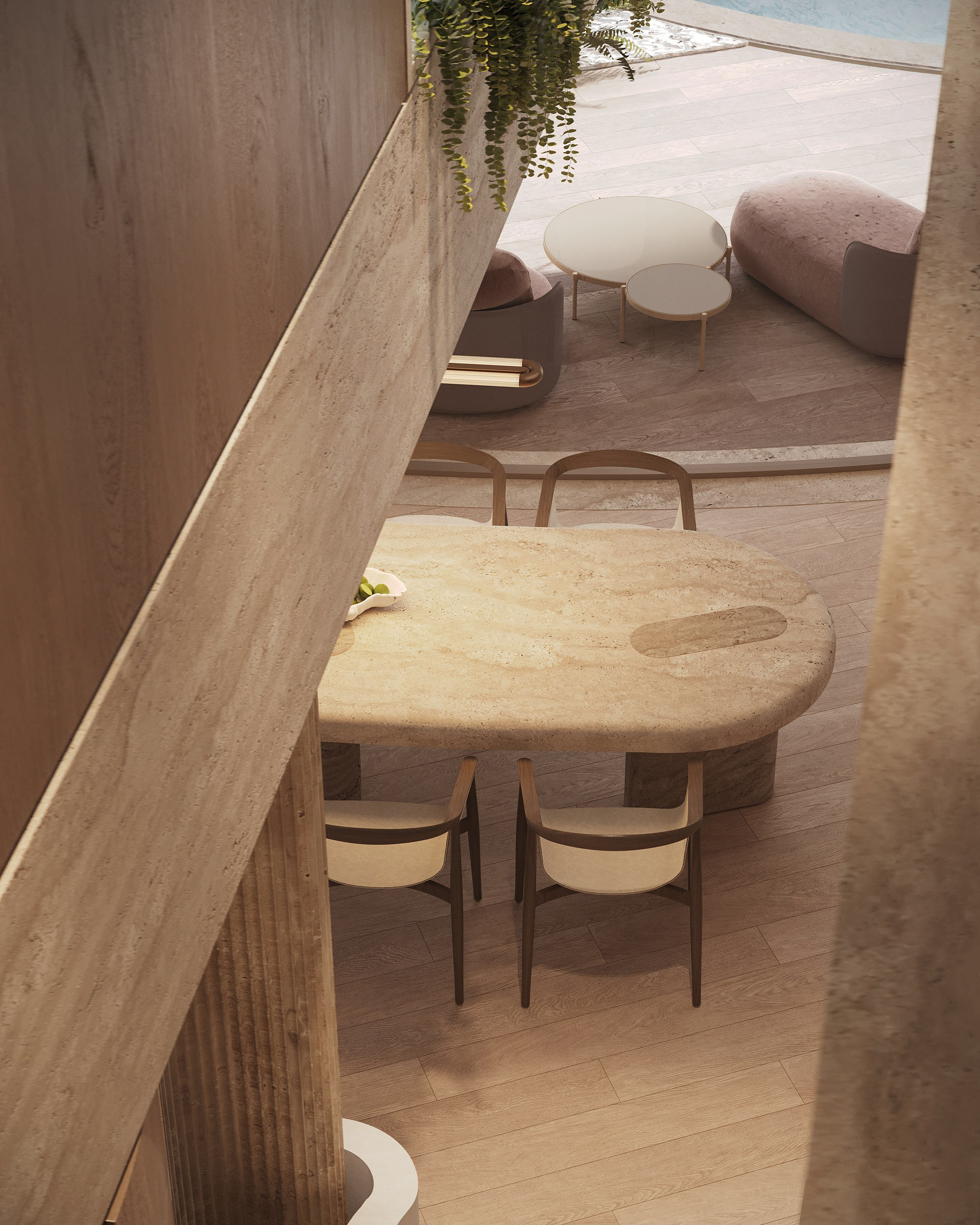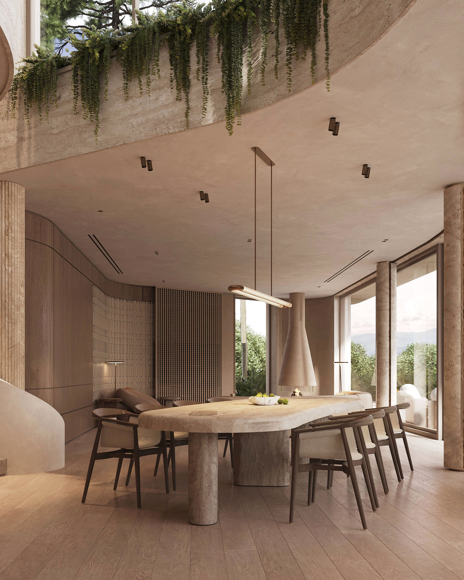 The centerpiece is a custom-carved travertine dining table. Its heavy, grounded presence is balanced by the fluid curves of the surrounding architecture, creating a dialogue between weight and airiness.