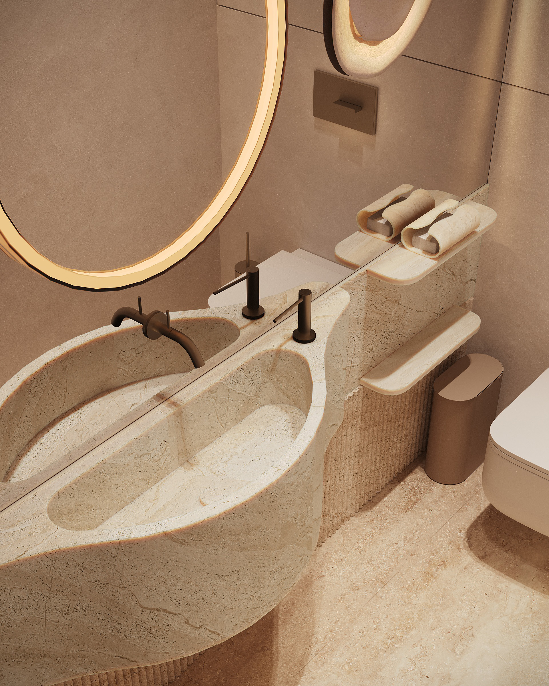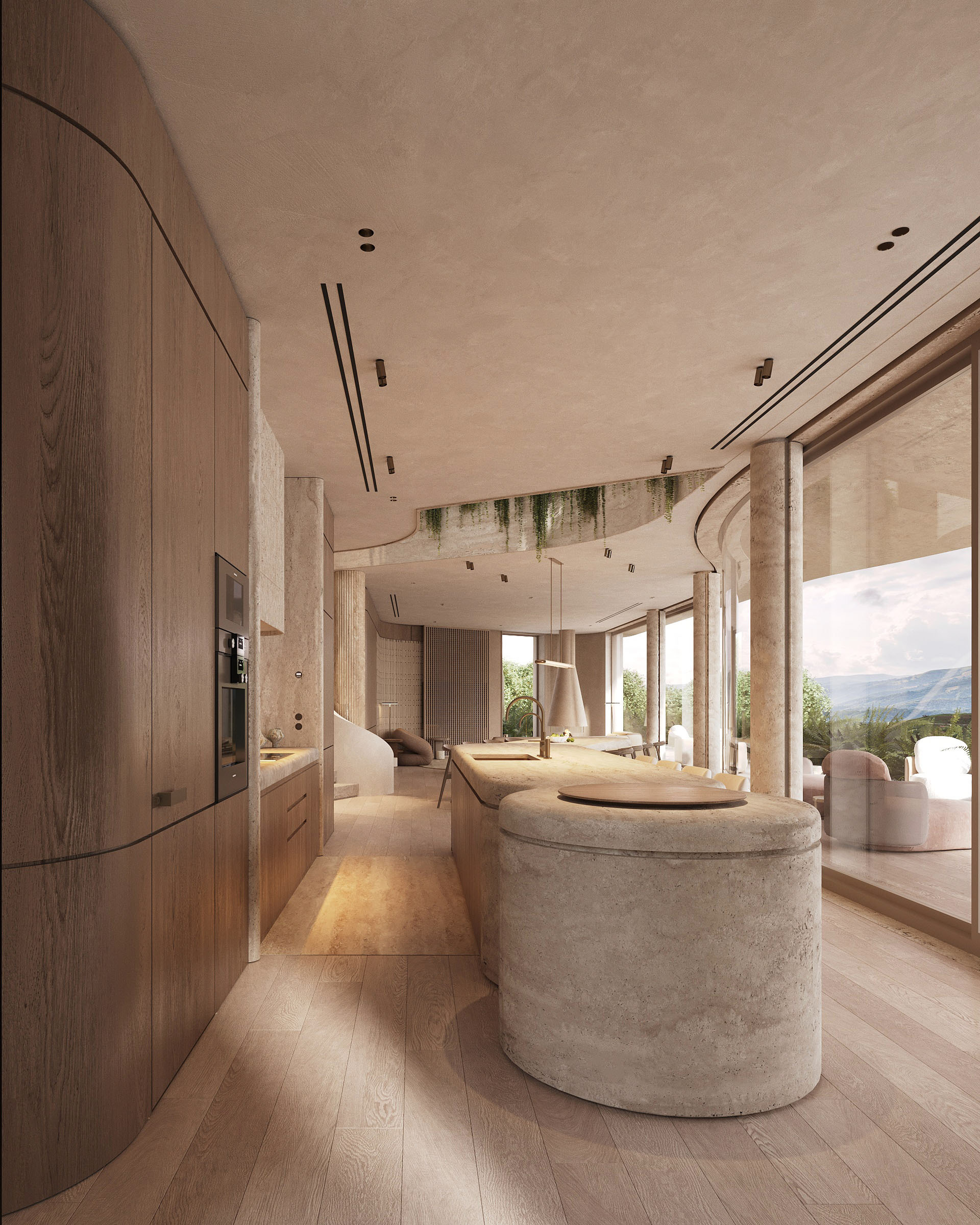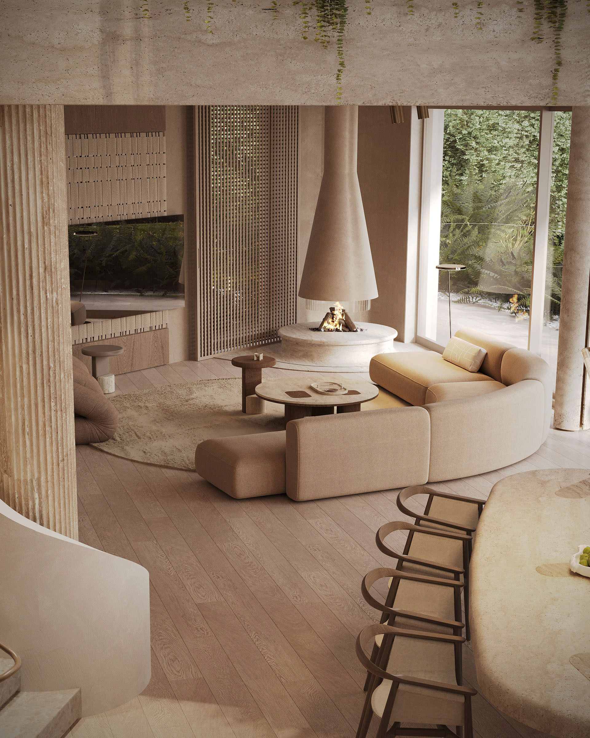The centerpiece is a custom-carved travertine dining table. Its heavy, grounded presence is balanced by the fluid curves of the surrounding architecture, creating a dialogue between weight and airiness.