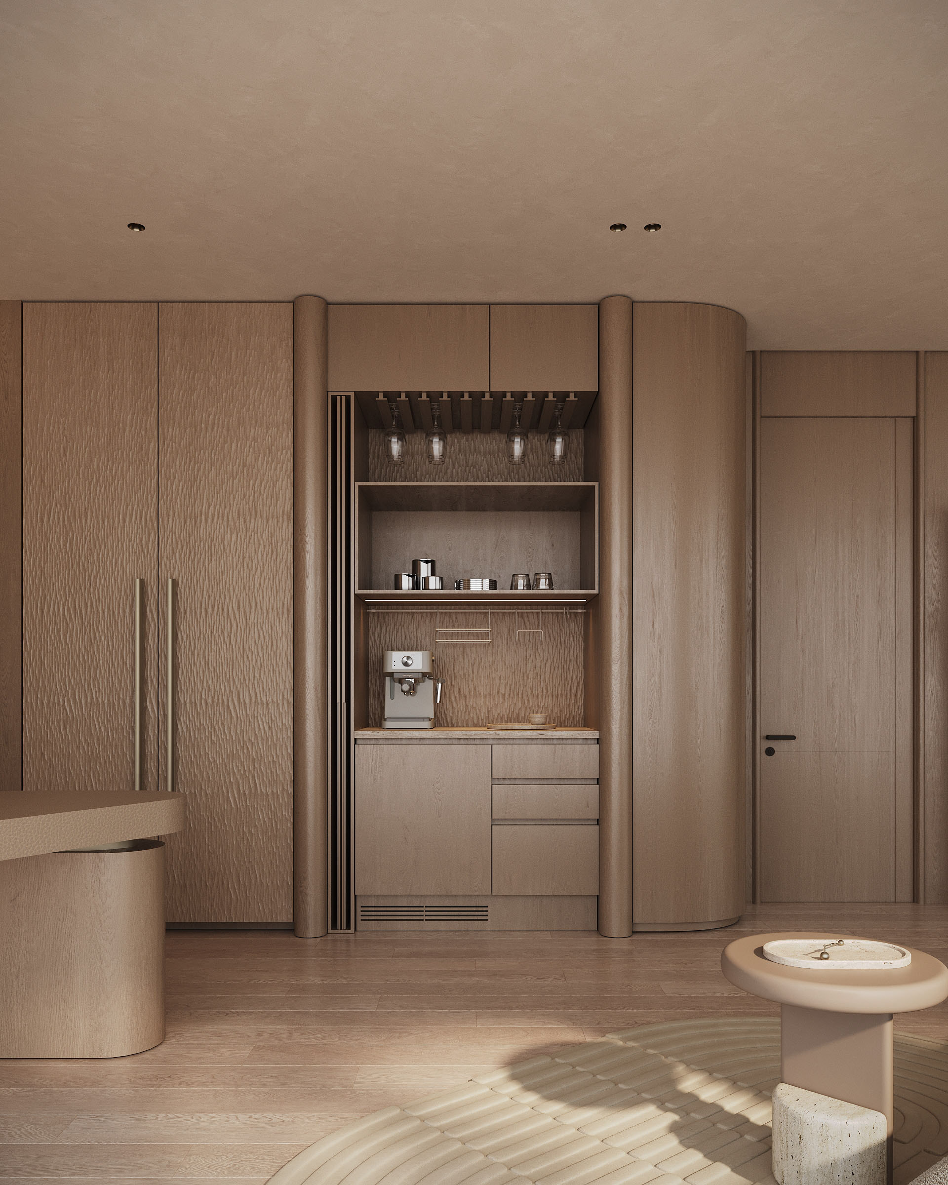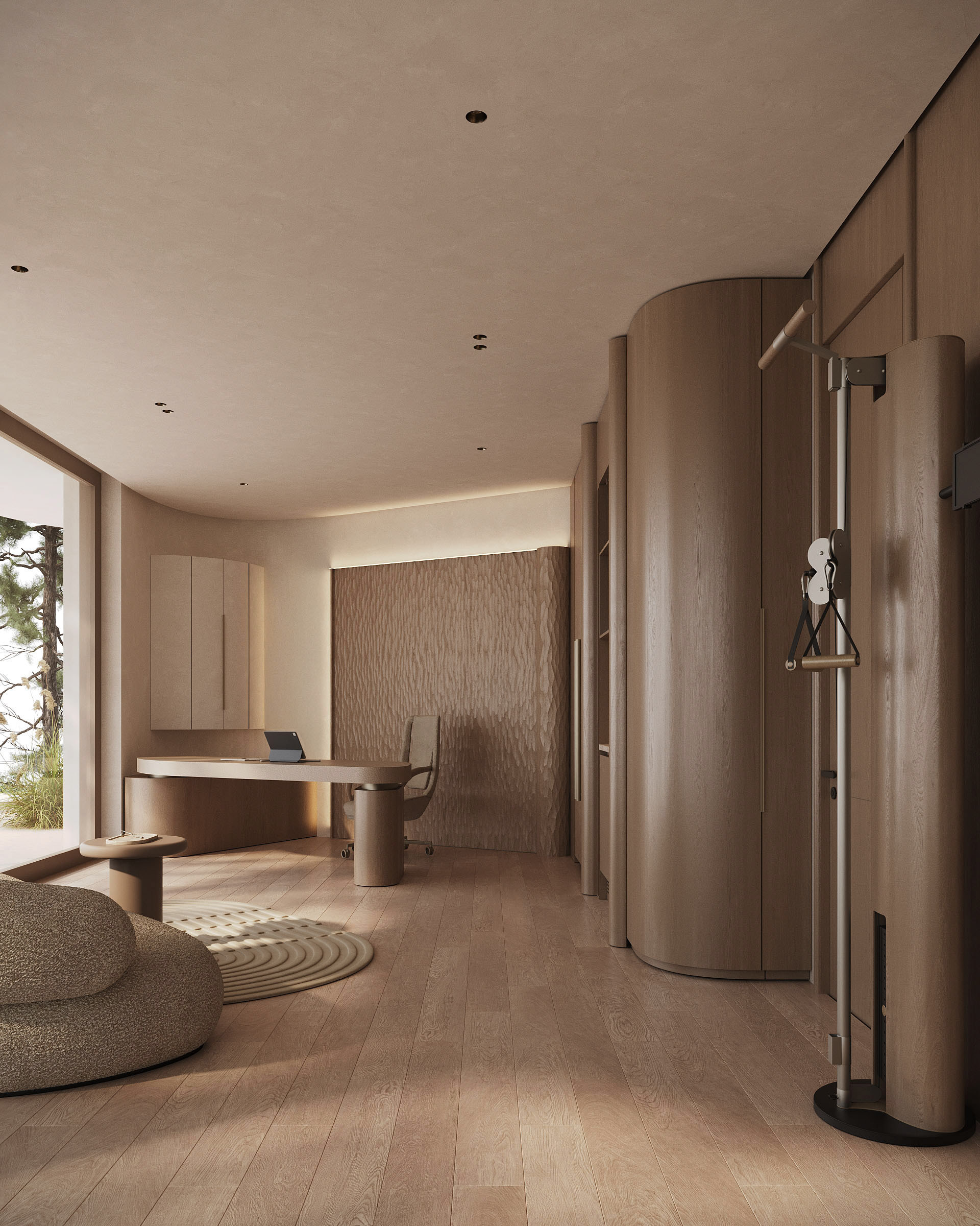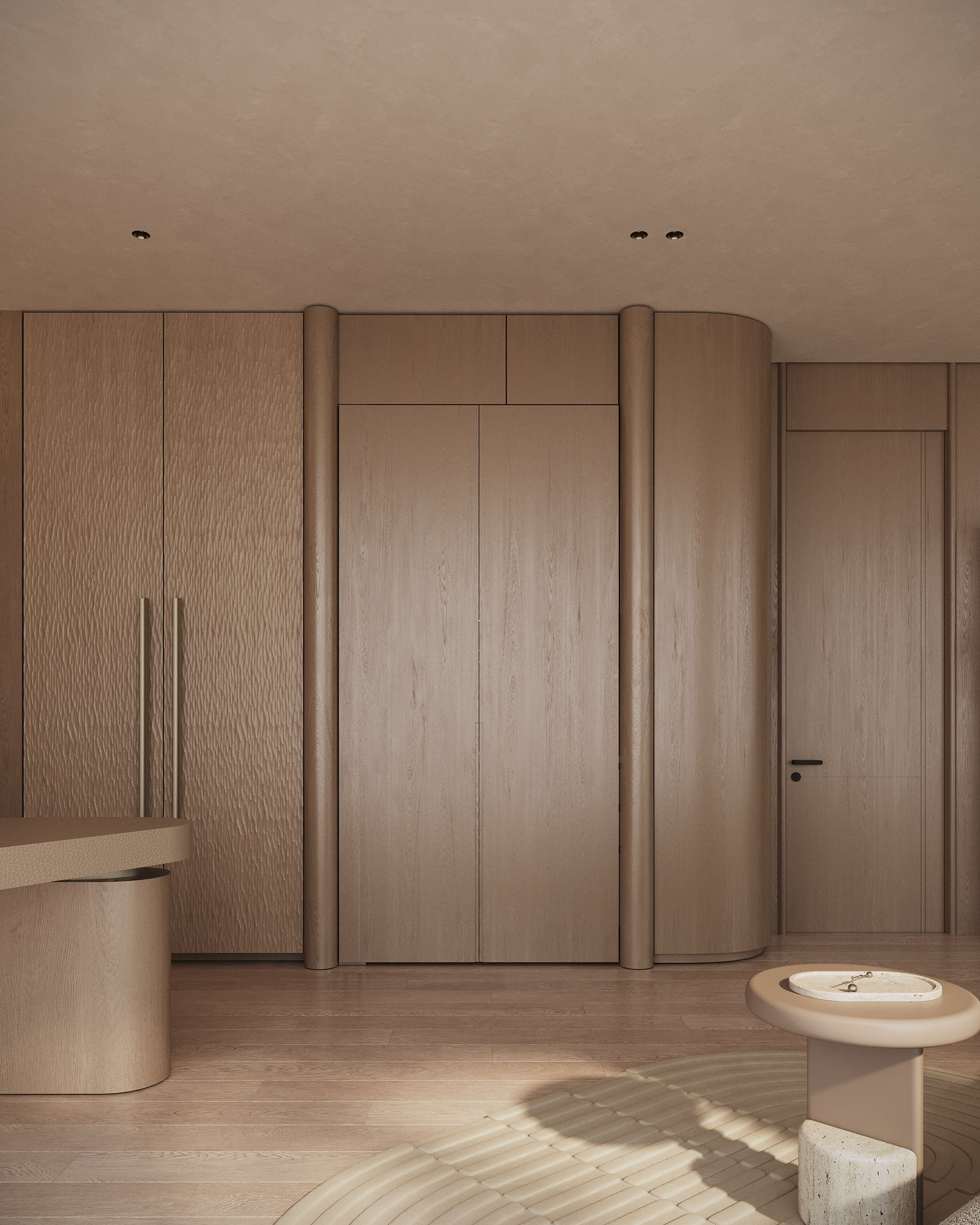 The space was designed around flow, of light, of air, of human movement. There are no sharp edges, no rigid transitions. The kitchen island flows into the dining area, and the staircase bends like a carved path.