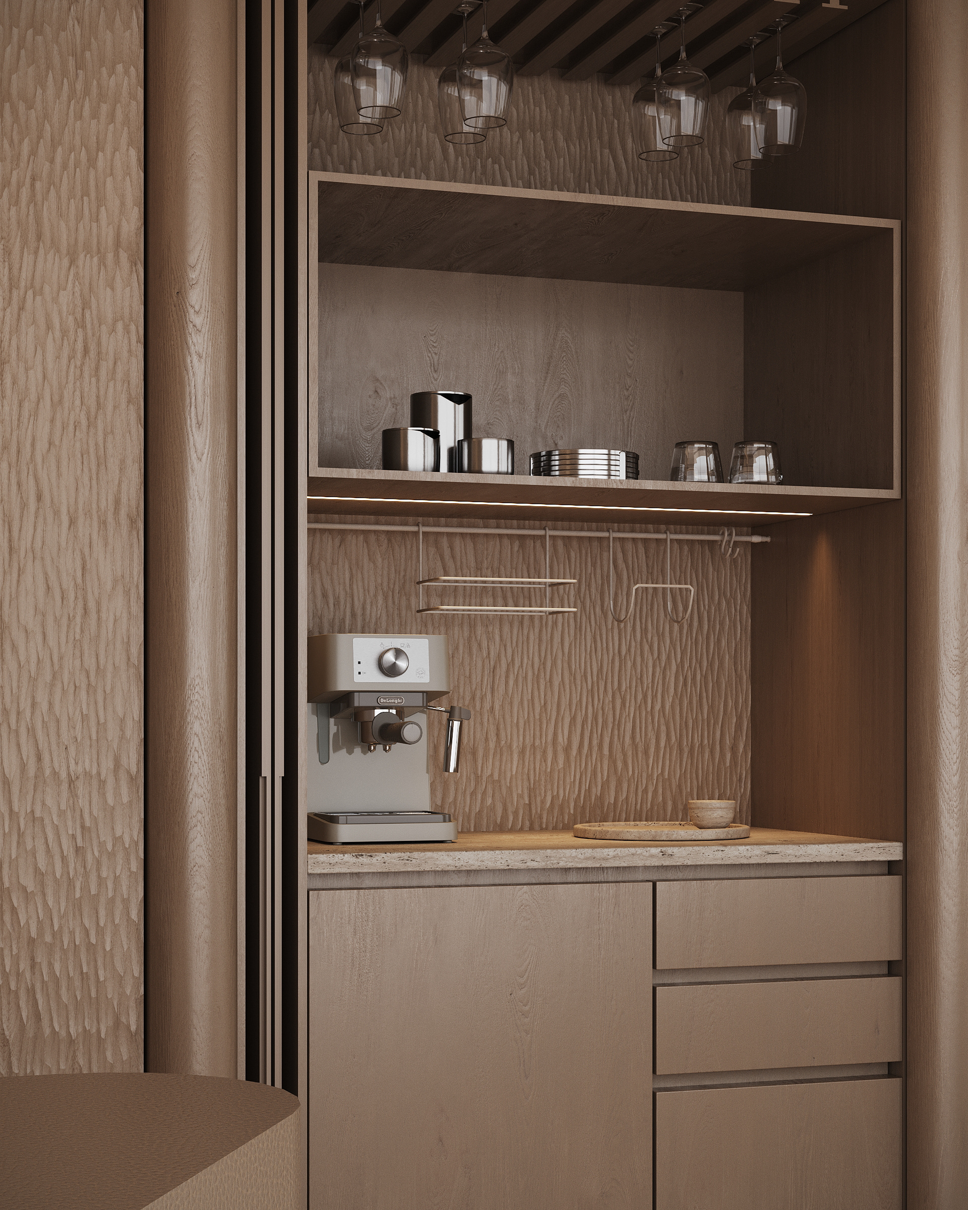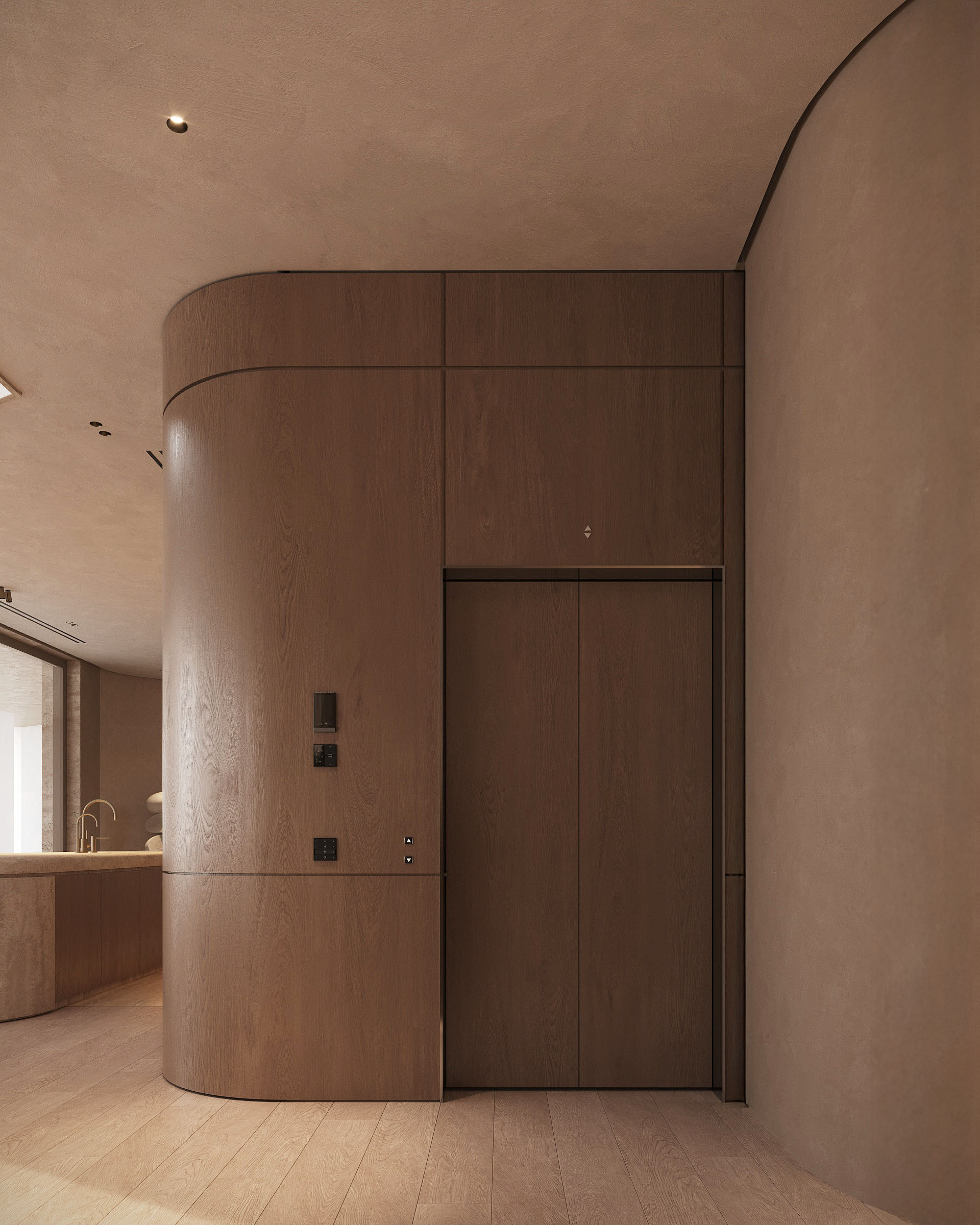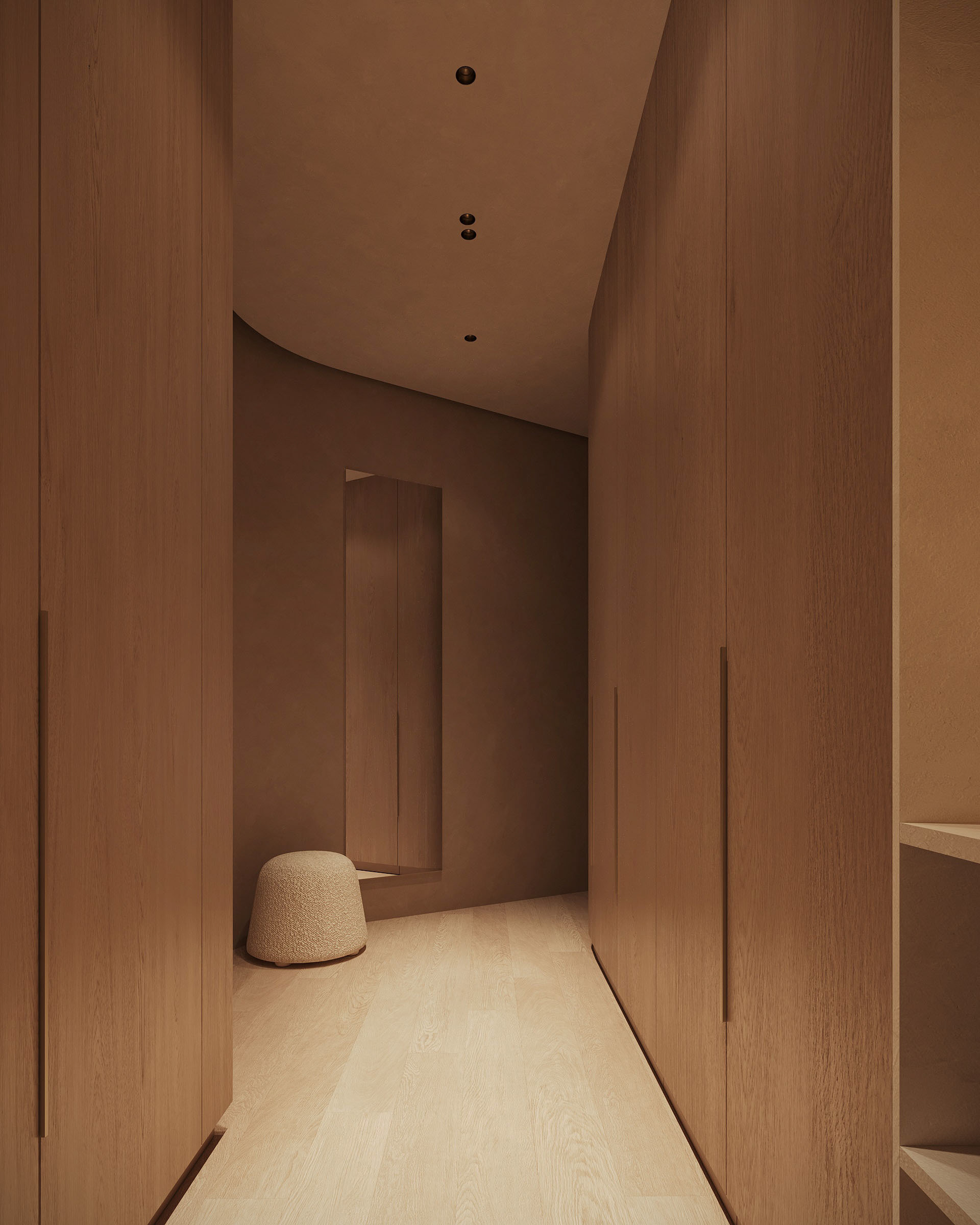 The staircase becomes a sculptural element of the interior - soft curves, integrated details, and natural materials make it feel as if carved from a single block. Warm wood, stone, and subtle lighting create a balance between monumentality and coziness.