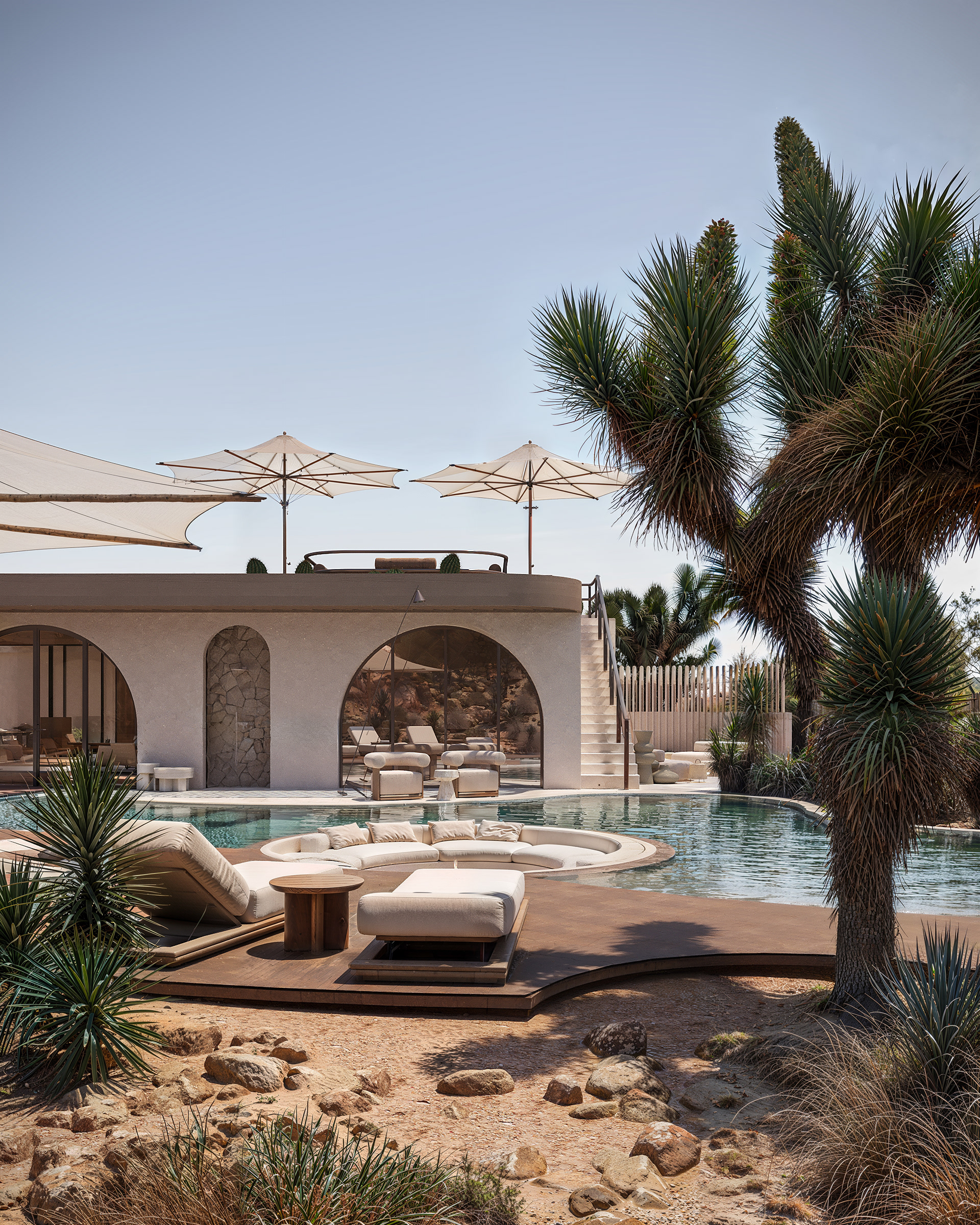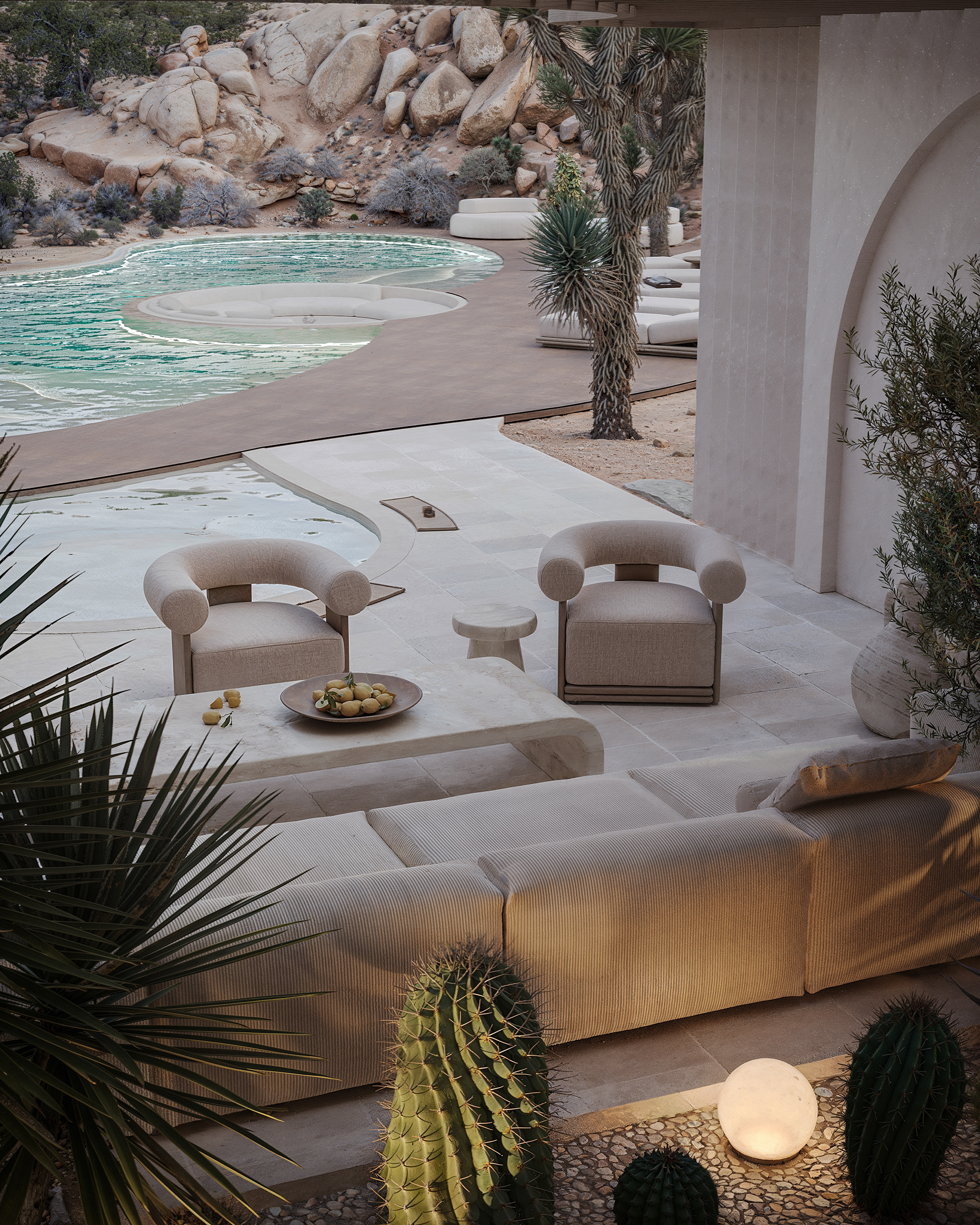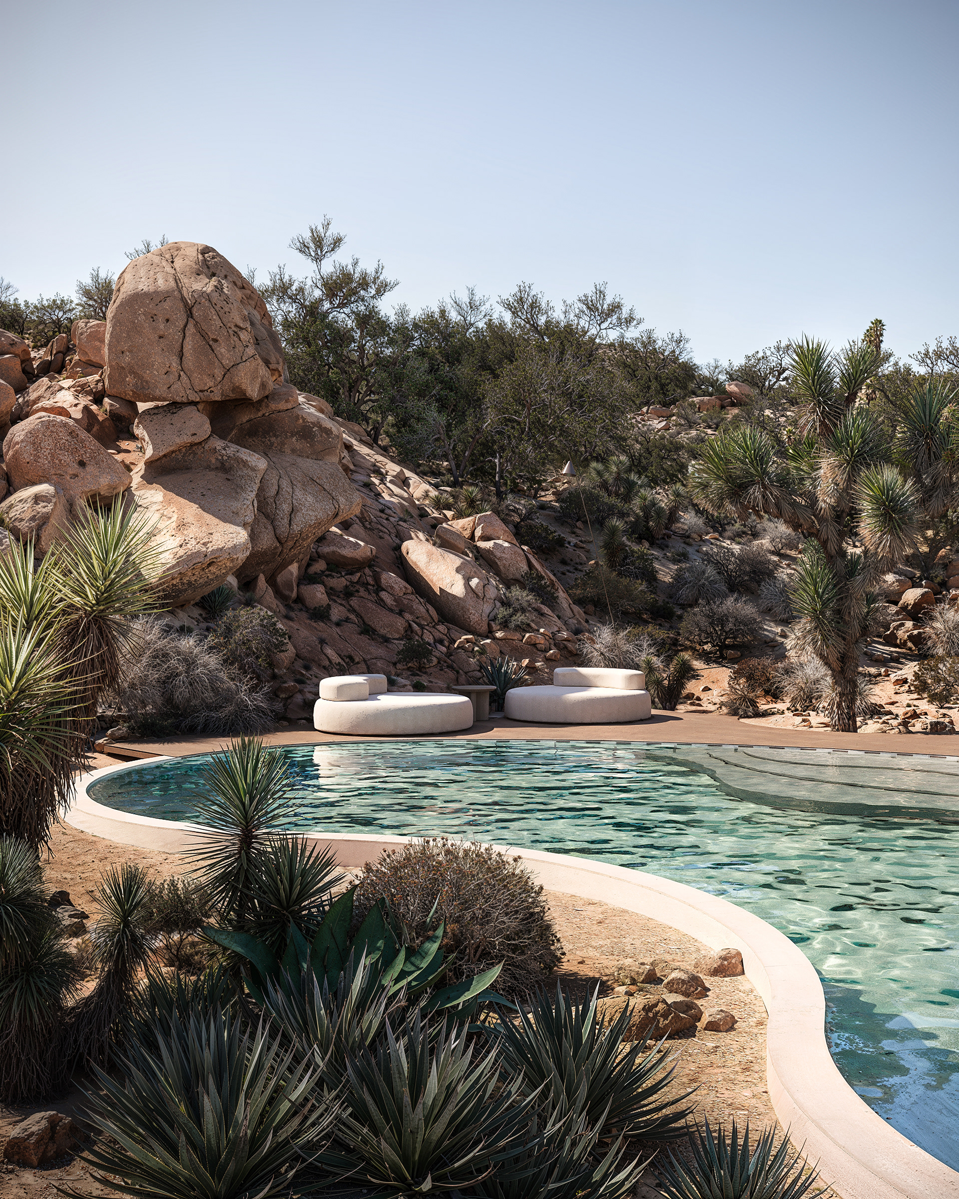The organically shaped pool is seamlessly integrated into the landscape, gracefully weaving between the architecture and the surrounding Joshua trees. Its flowing form defines several relaxation areas: a shaded lounge near the jacuzzi by the house, a central sunken seating zone with a fire pit for evening gatherings, and an open sunbathing terrace nestled among rocks and desert vegetation. The overall concept reflects the essence of this location — a connection with nature, tranquility, and a slowed rhythm of life.