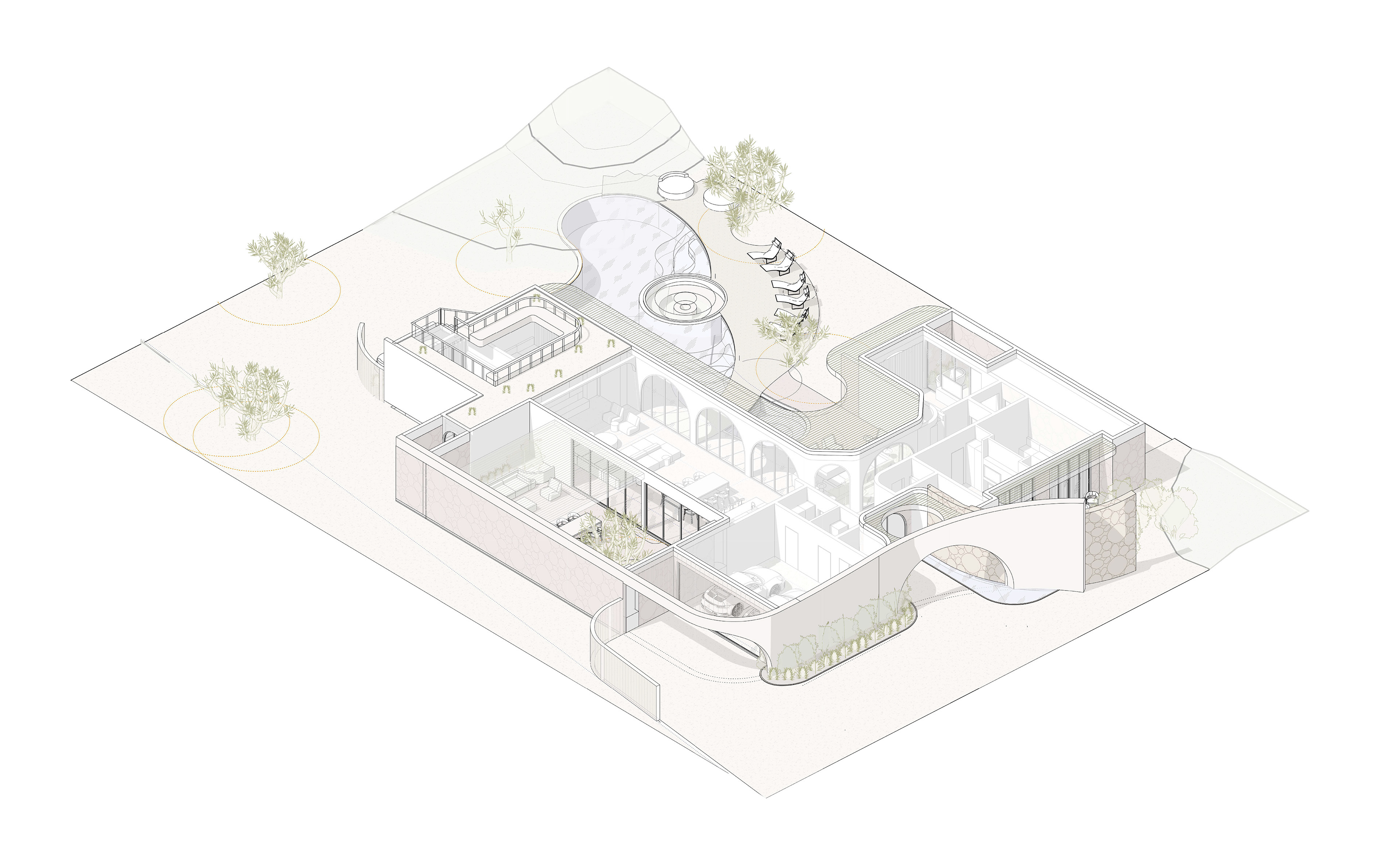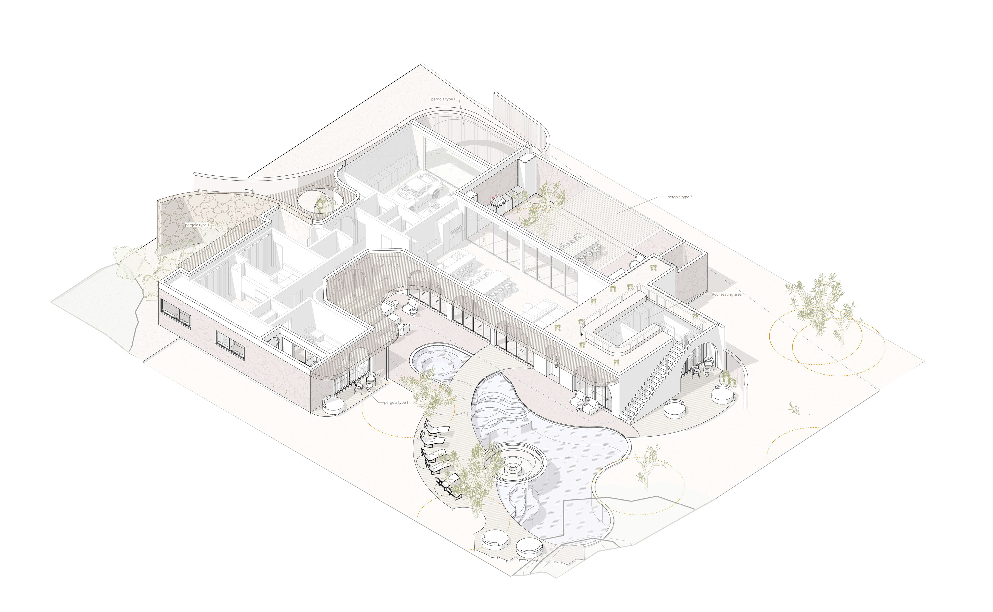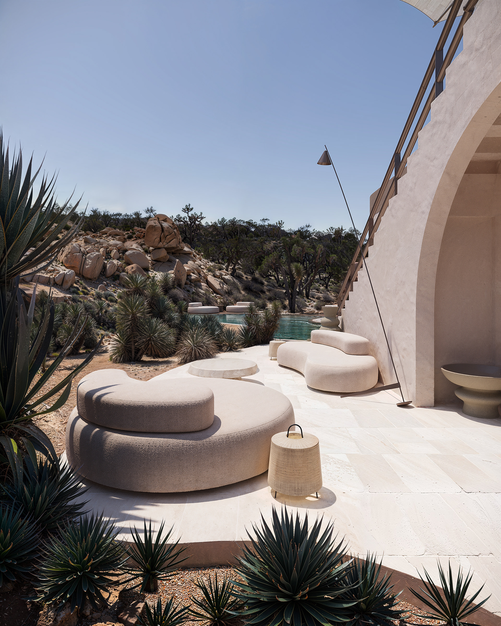 The organically shaped pool is seamlessly integrated into the landscape, gracefully weaving between the architecture and the surrounding Joshua trees. Its flowing form defines several relaxation areas: a shaded lounge near the jacuzzi by the house, a central sunken seating zone with a fire pit for evening gatherings, and an open sunbathing terrace nestled among rocks and desert vegetation. The overall concept reflects the essence of this location — a connection with nature, tranquility, and a slowed rhythm of life.