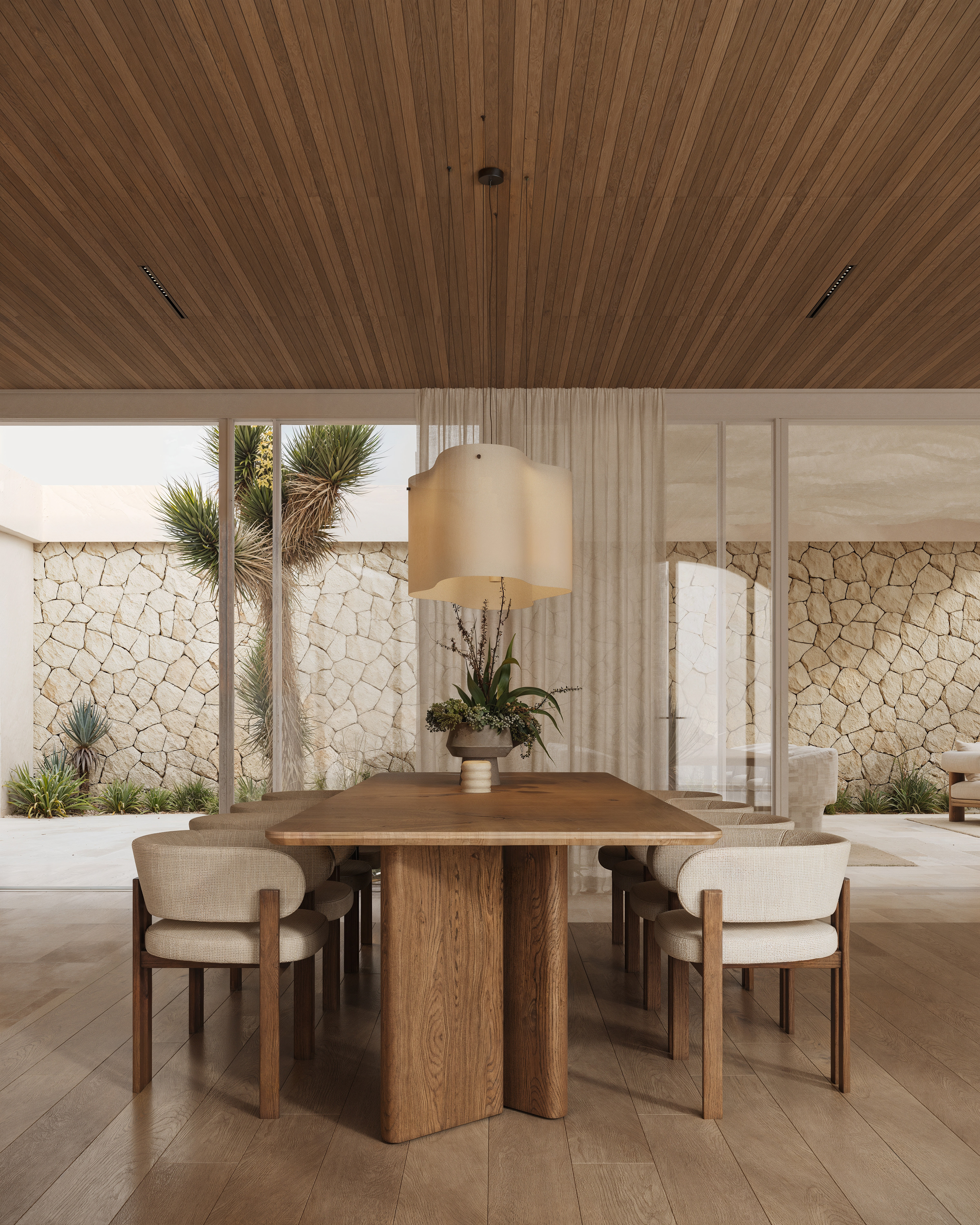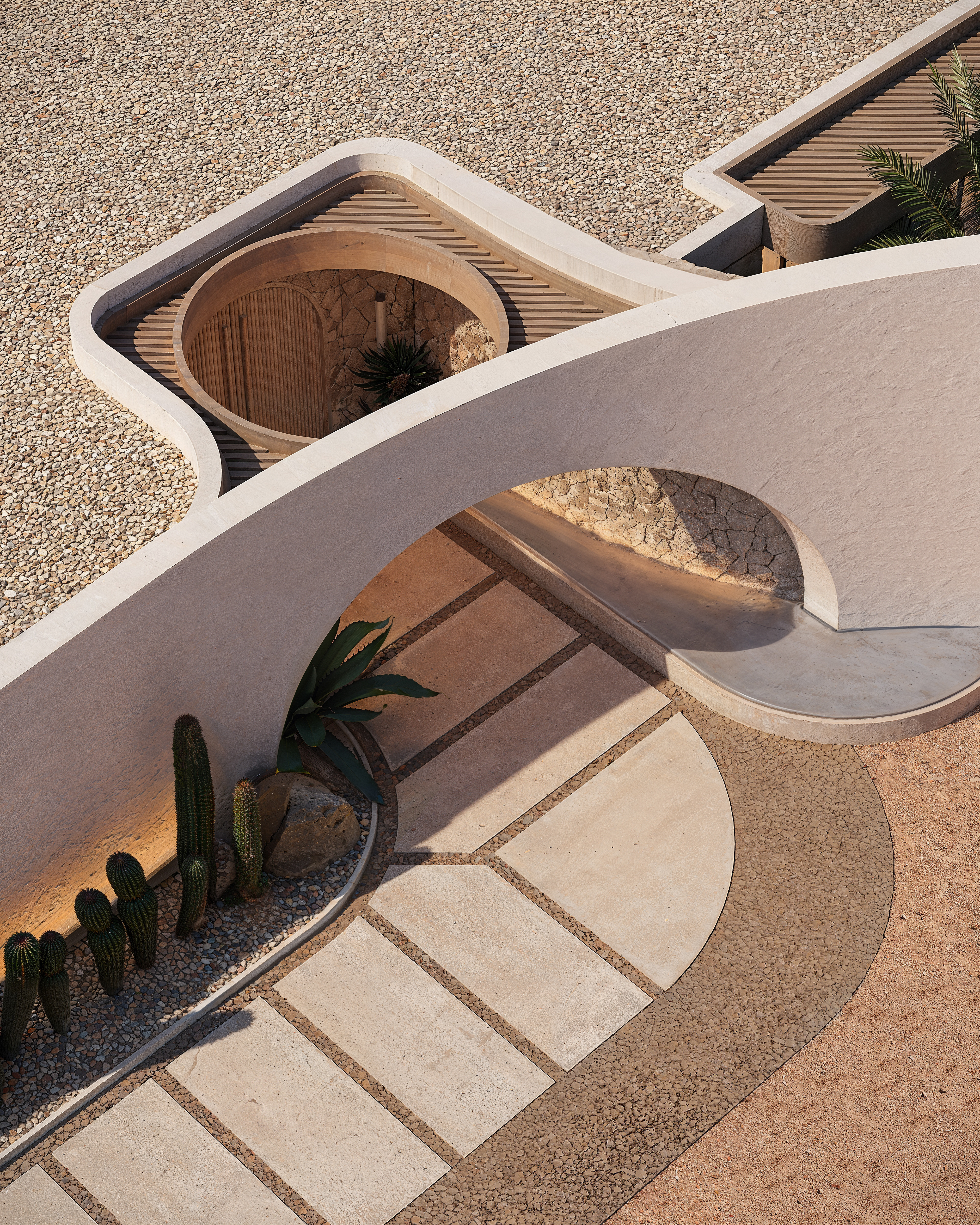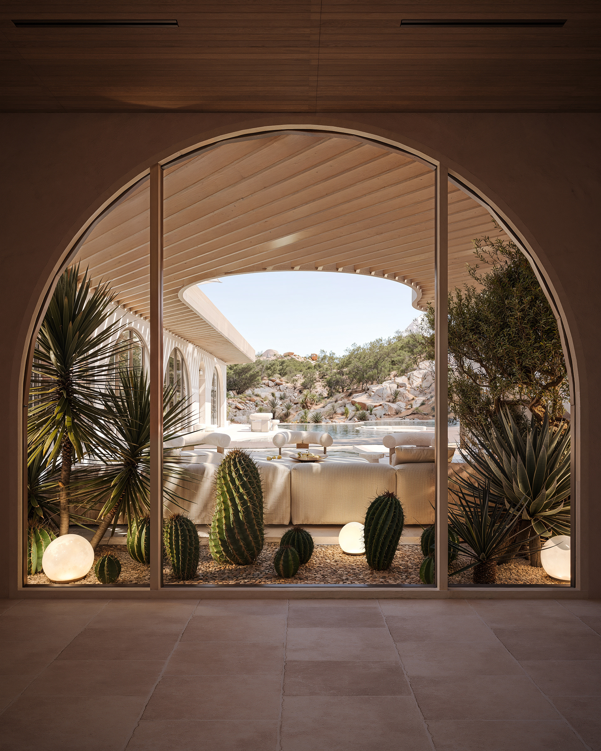 The location sets the tone. Raw landscape, strong light, dramatic scale. Our job was not to compete with that, but to create a retreat that feels natural in this context: timeless, calm, and quietly distinctive. The villa is designed as an inward-oriented composition. From the outside, it reads as a restrained, protective volume responding to heat, wind, and privacy. Once inside, the architecture opens gradually — revealing courtyards, framed sky views, and carefully measured transitions between interior and exterior spaces. This sequence allows residents to move from the vast, harsh landscape into a controlled, intimate environment without losing connection to the surroundings.