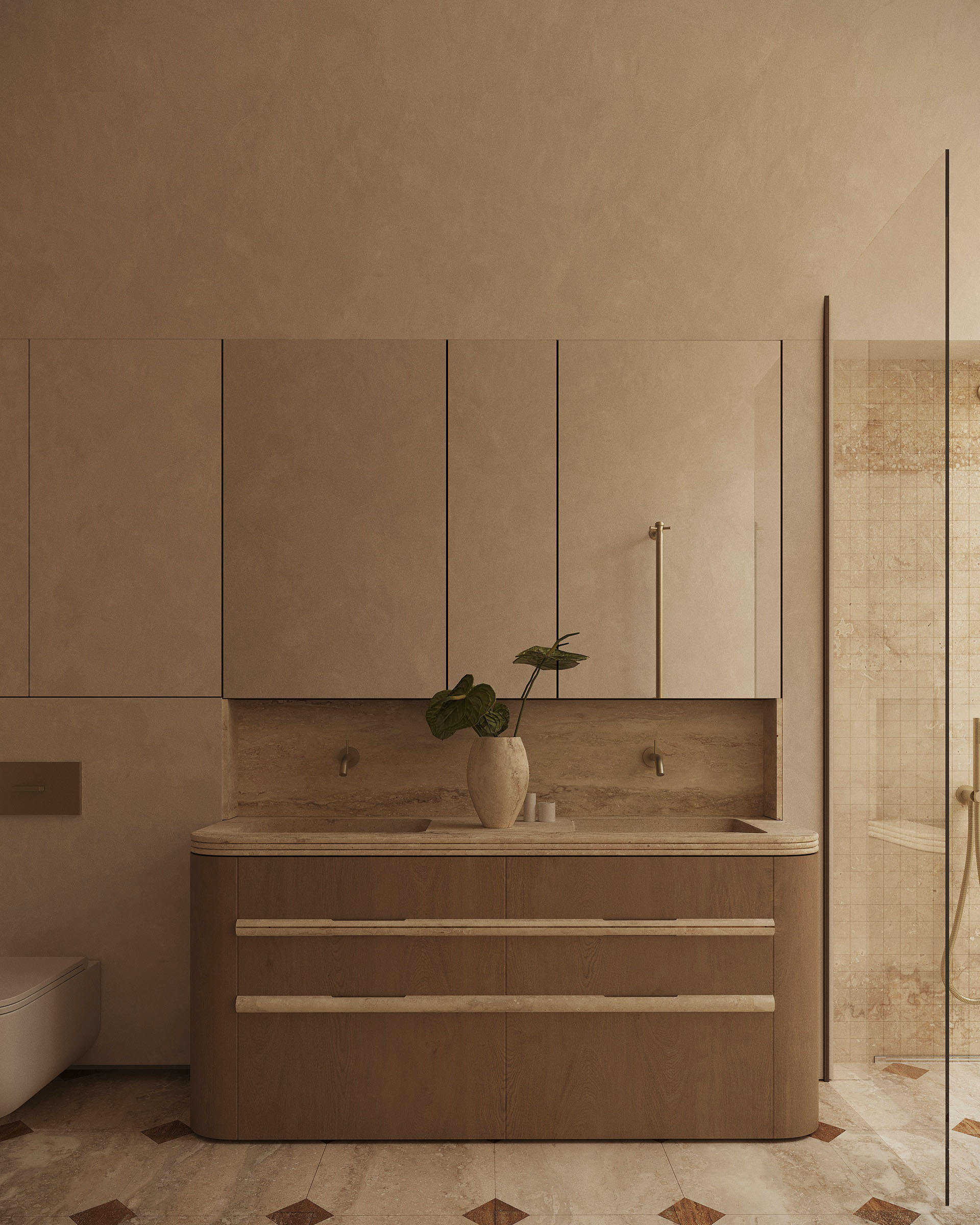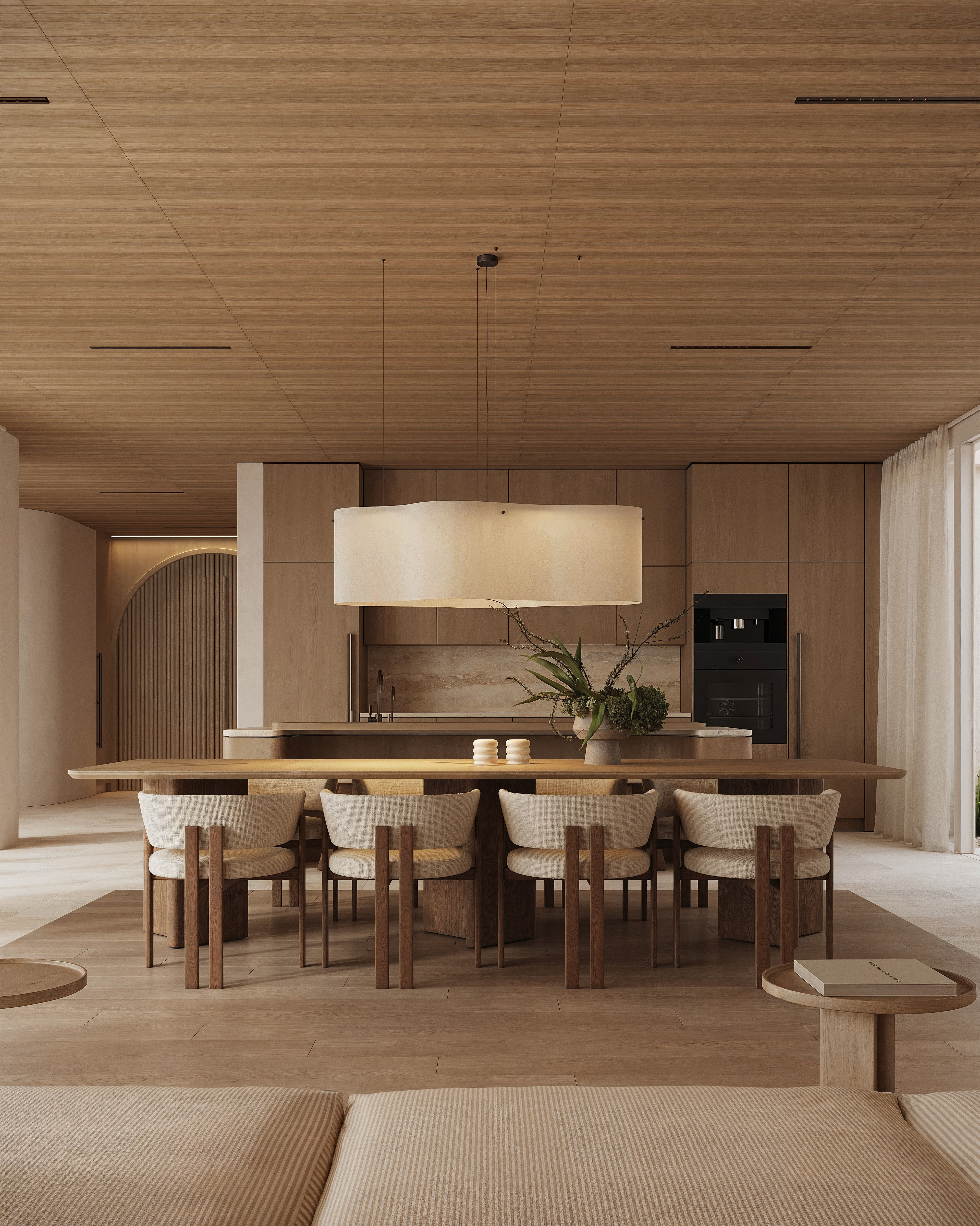 Curved elements and softened transitions are used deliberately to slow movement through the house and create a sense of flow. There are no sharp visual breaks—spaces connect gradually, allowing the interior to feel cohesive and intuitive.