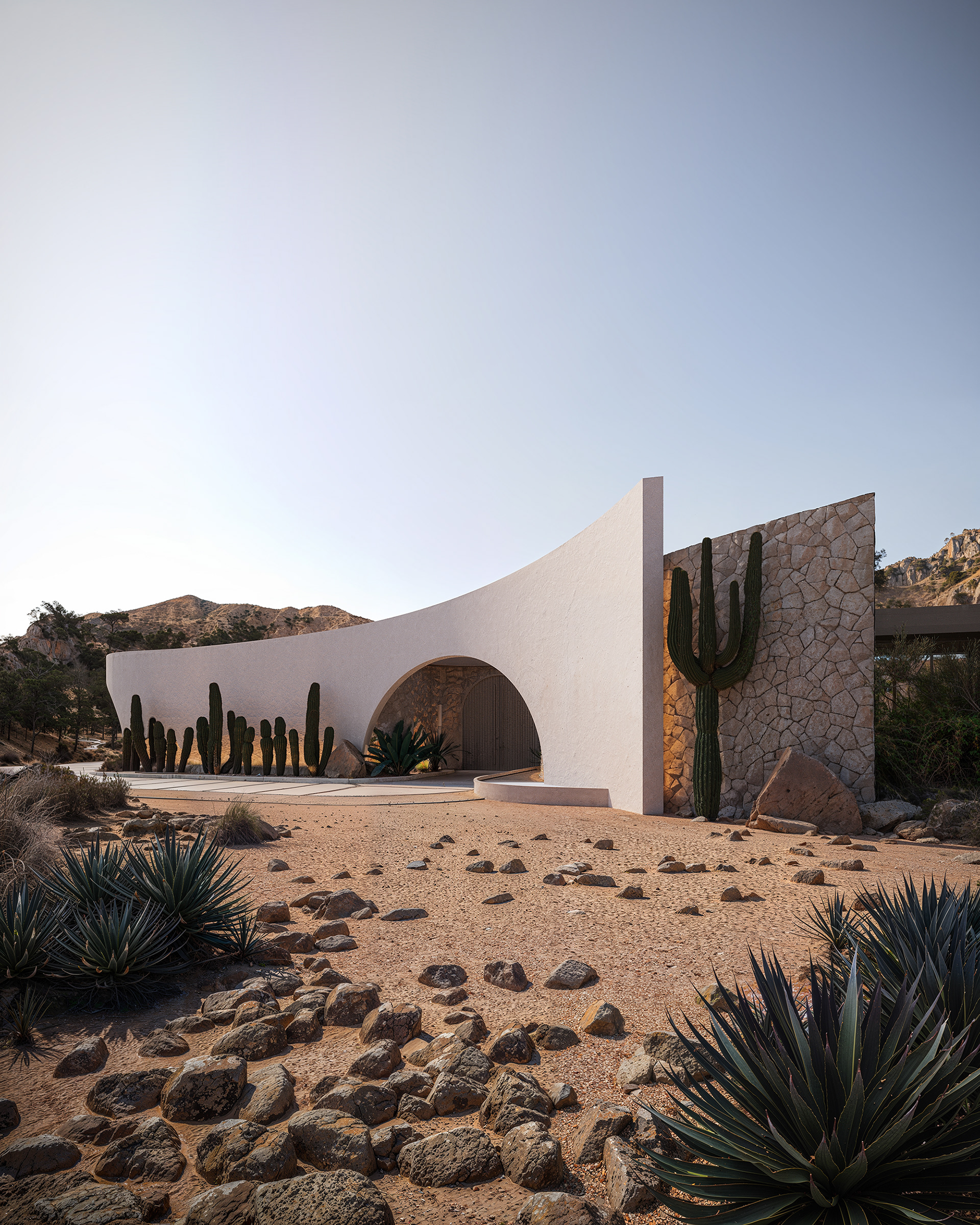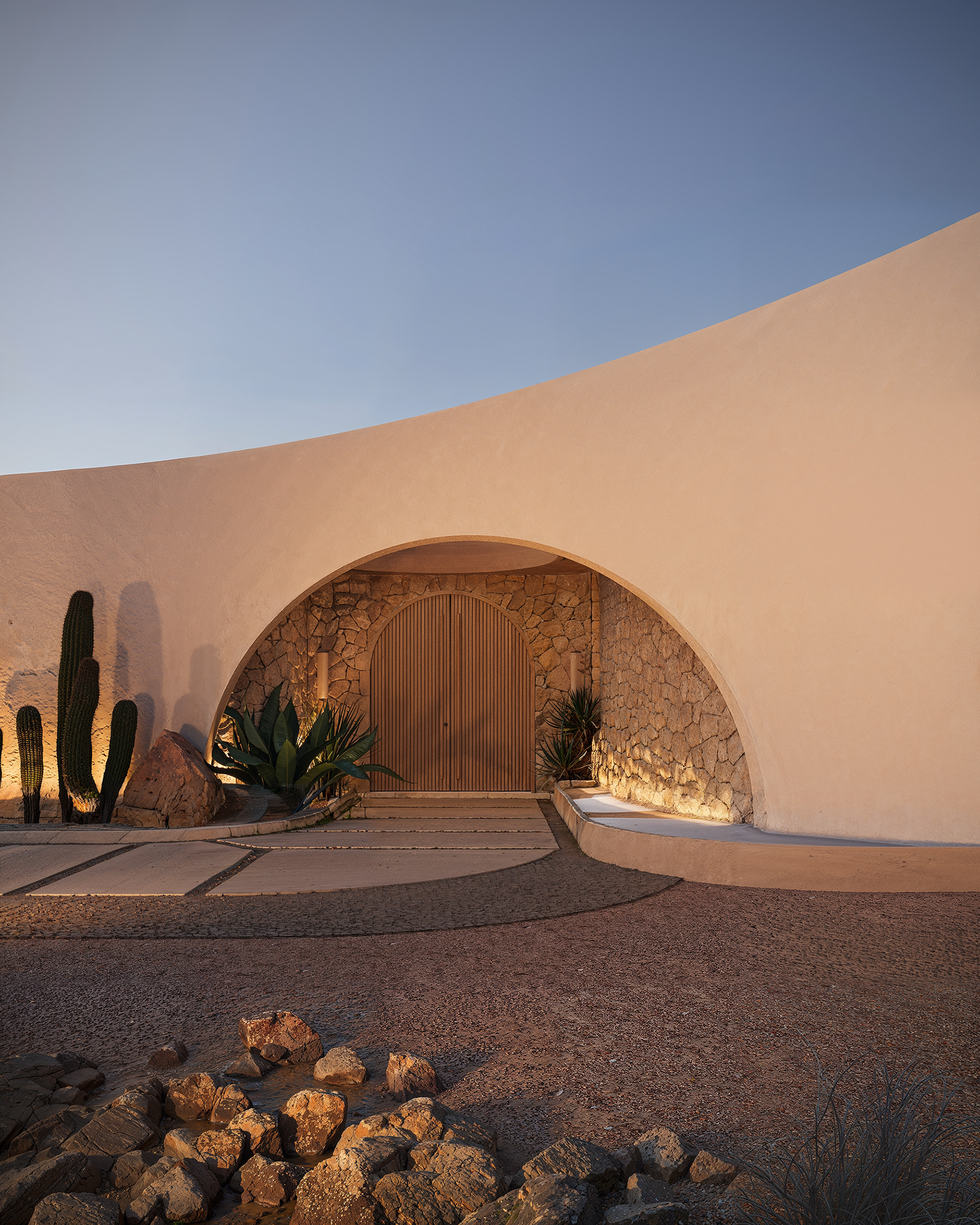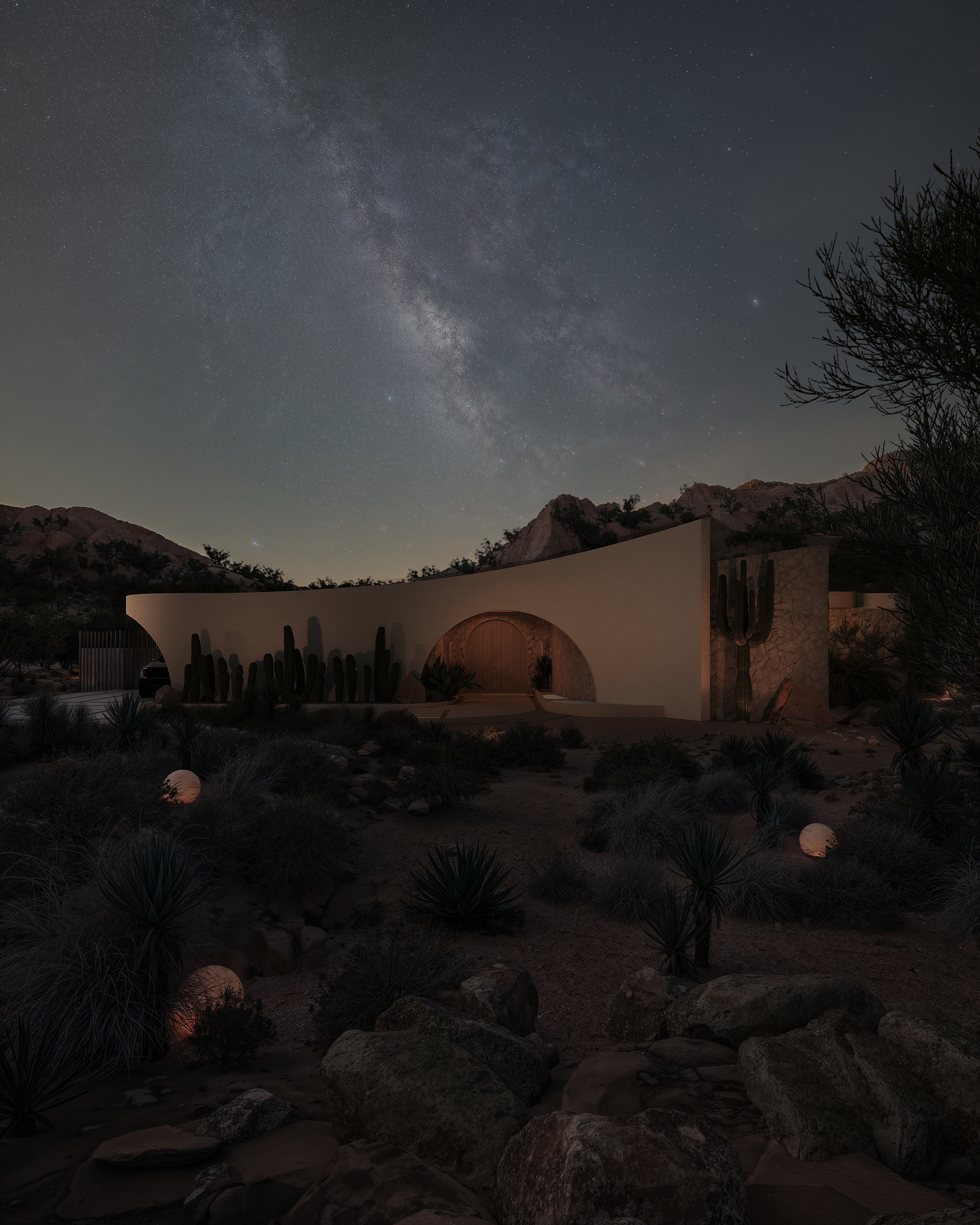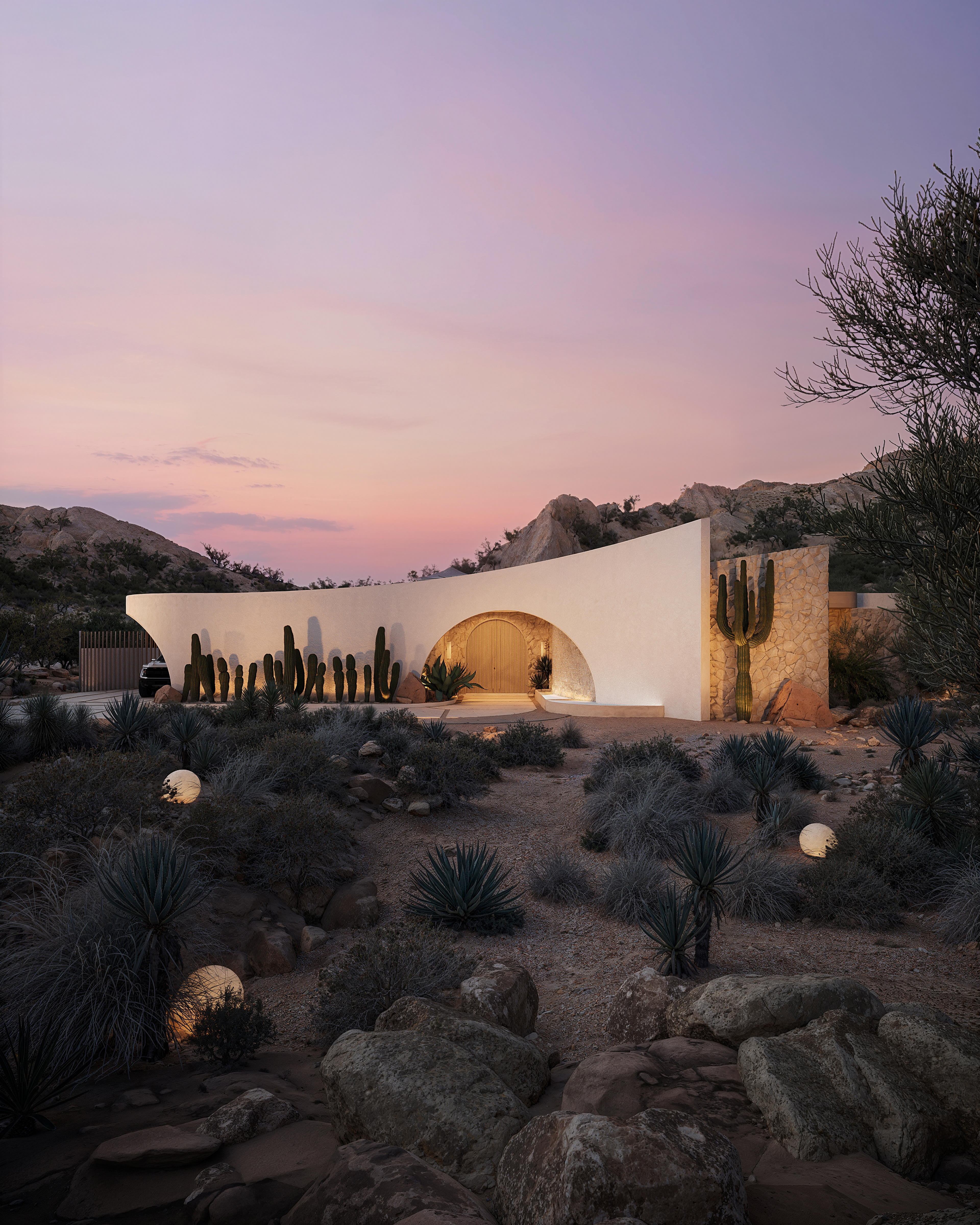 The main façade features a smooth, double-layered form that dynamically wraps around the building’s contour, adding depth and a sense of movement. An accent wall with cacti and soft lighting enhances the desert character of the landscape, enriching the composition with texture and volume in the evening. A covered parking area for additional vehicles complements the enclosed garage, ensuring both functionality and architectural harmony.