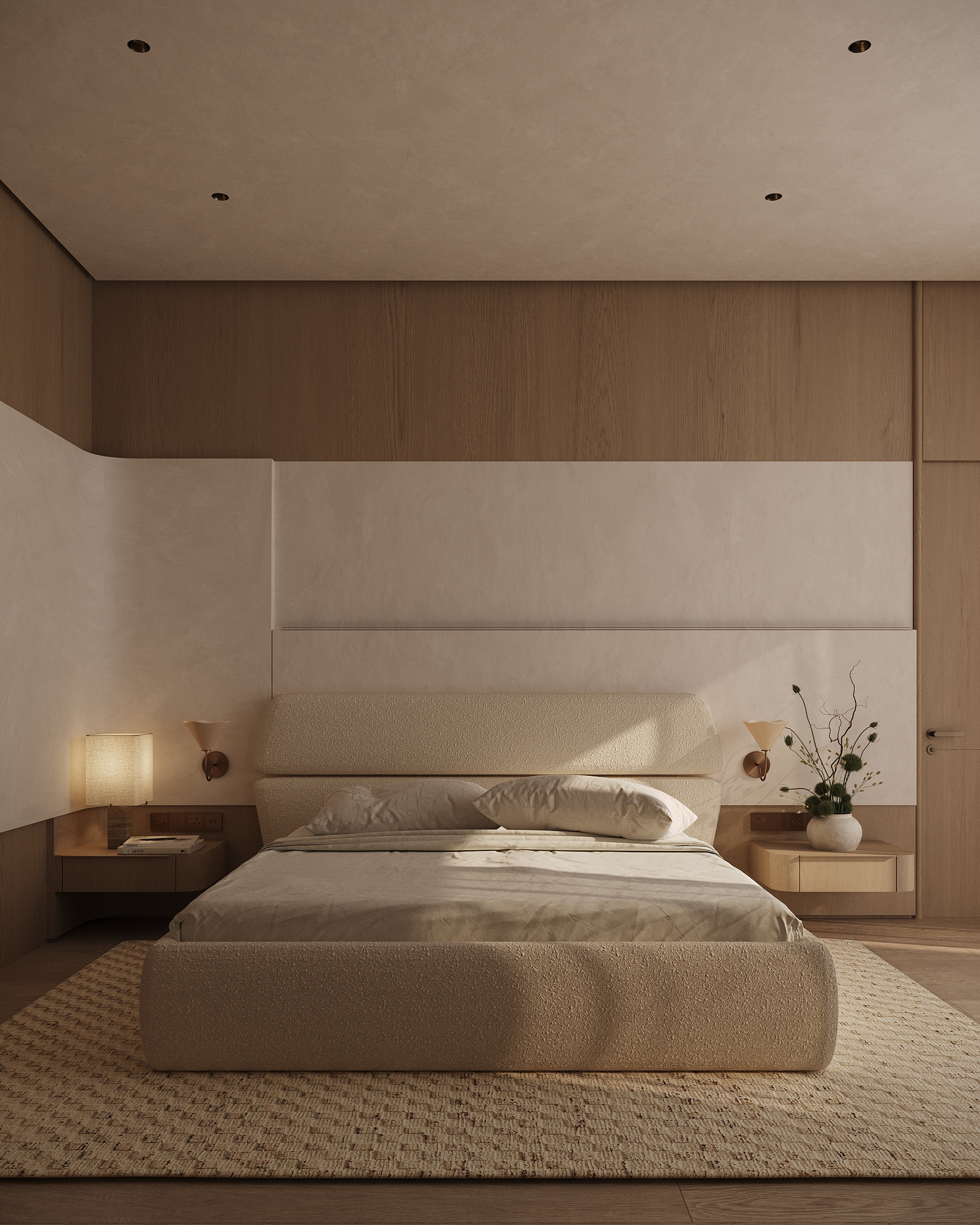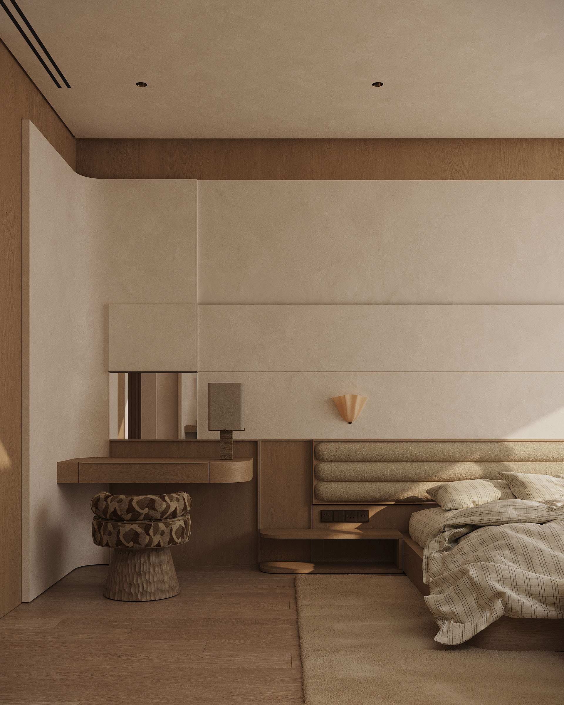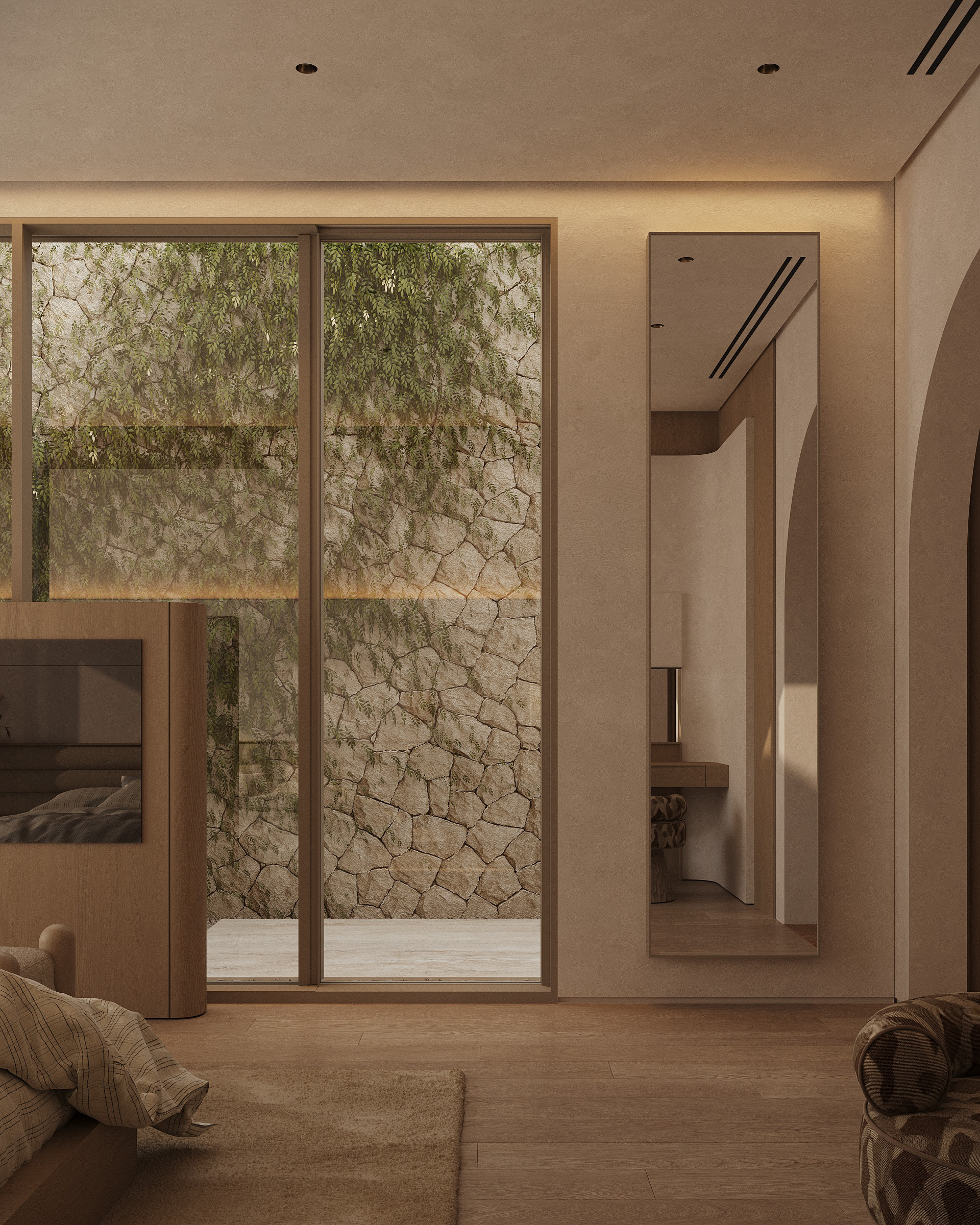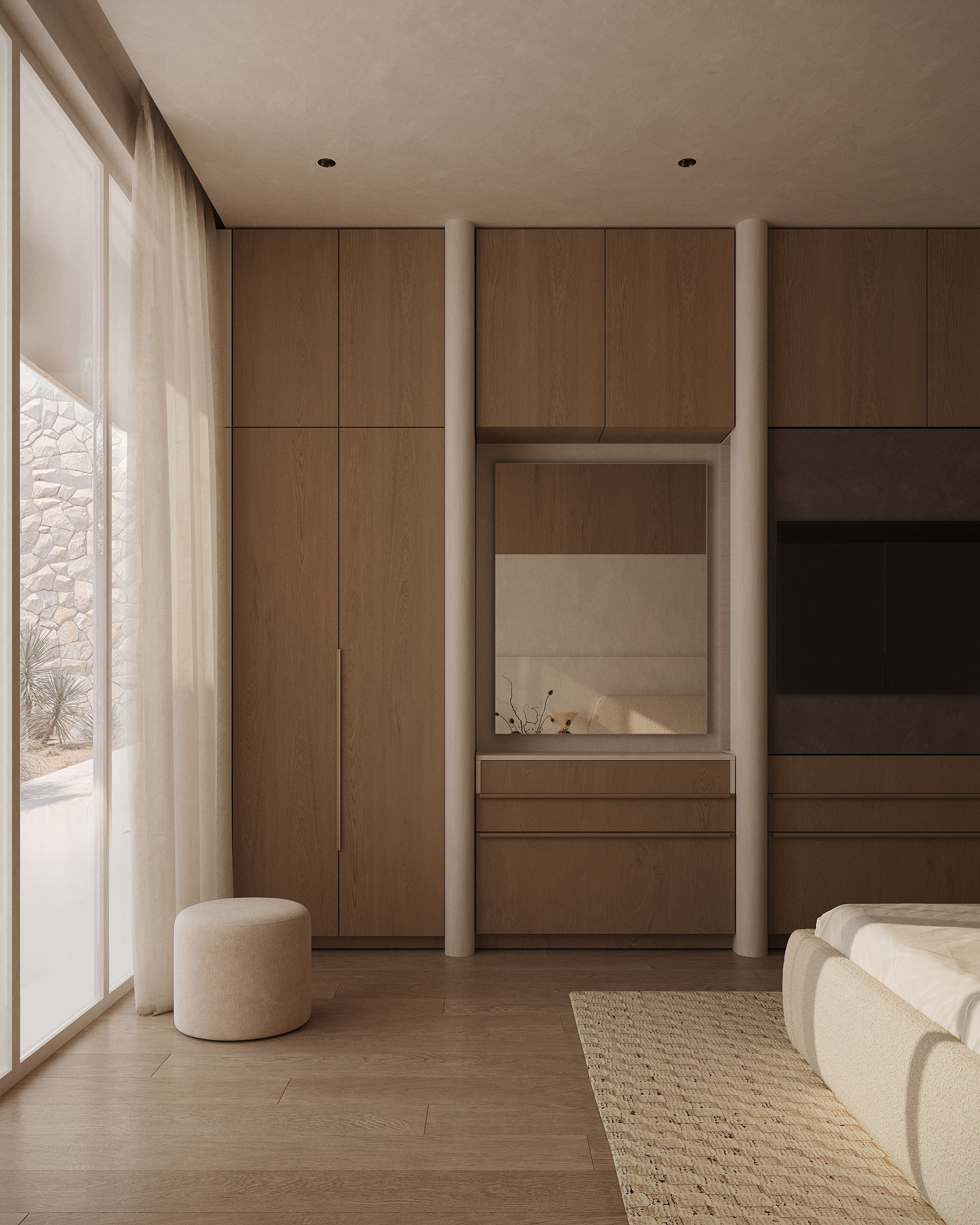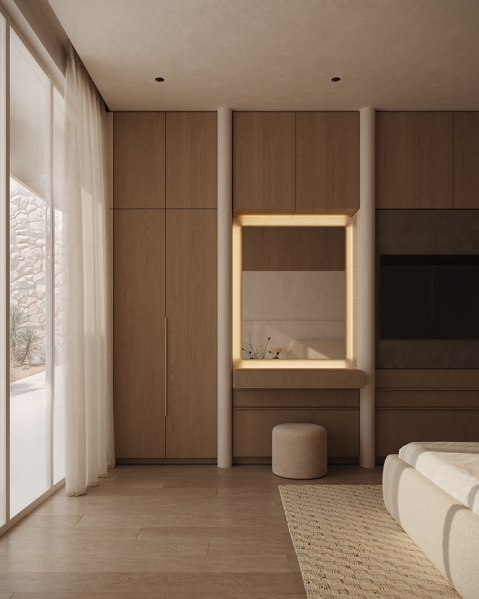 The master suite is conceived as the most private and restorative space of the villa, oriented toward the inner courtyard rather than the open desert. This decision transforms the bedroom into a protected environment — quiet, shaded, and visually contained—while still maintaining a strong connection to nature.
