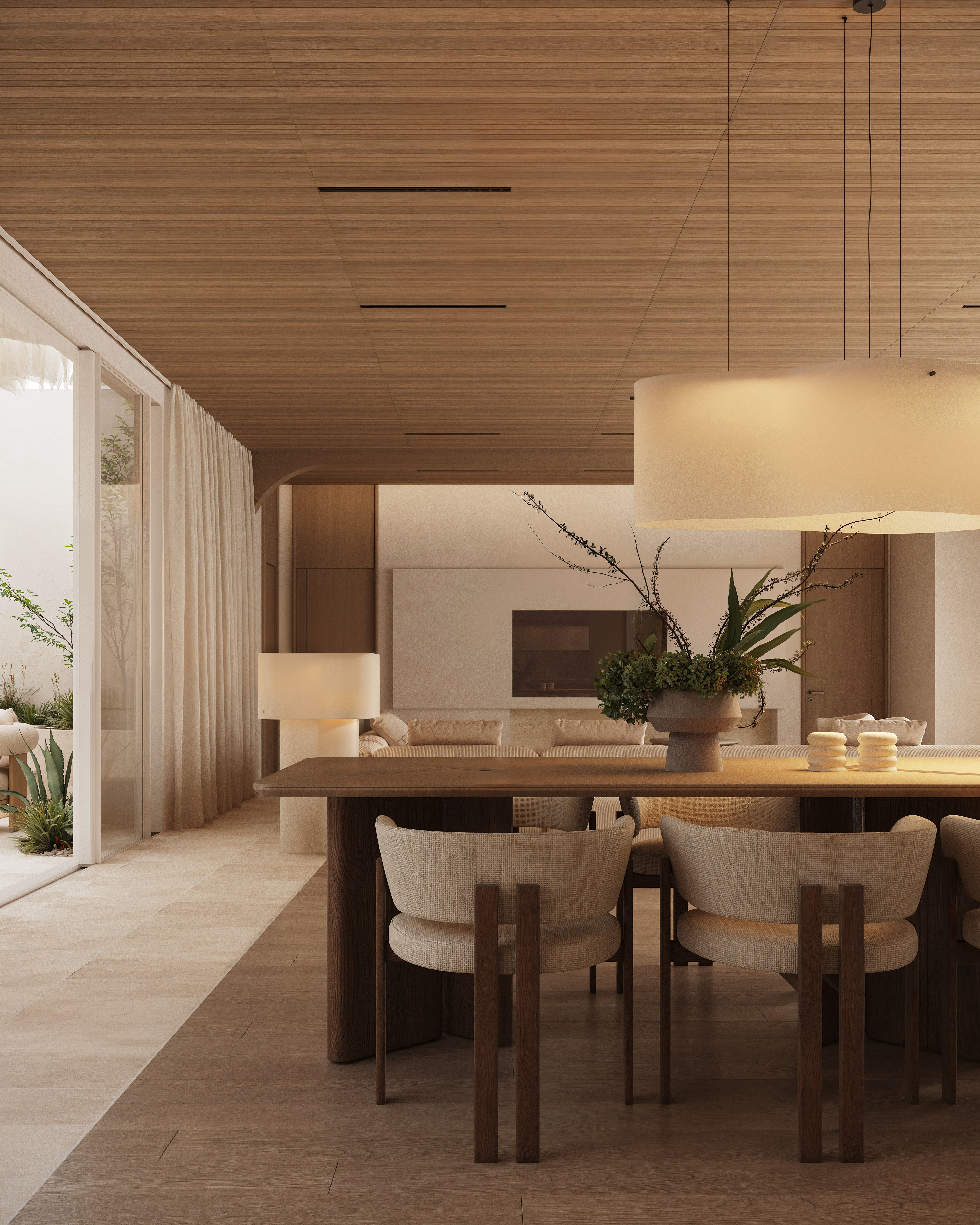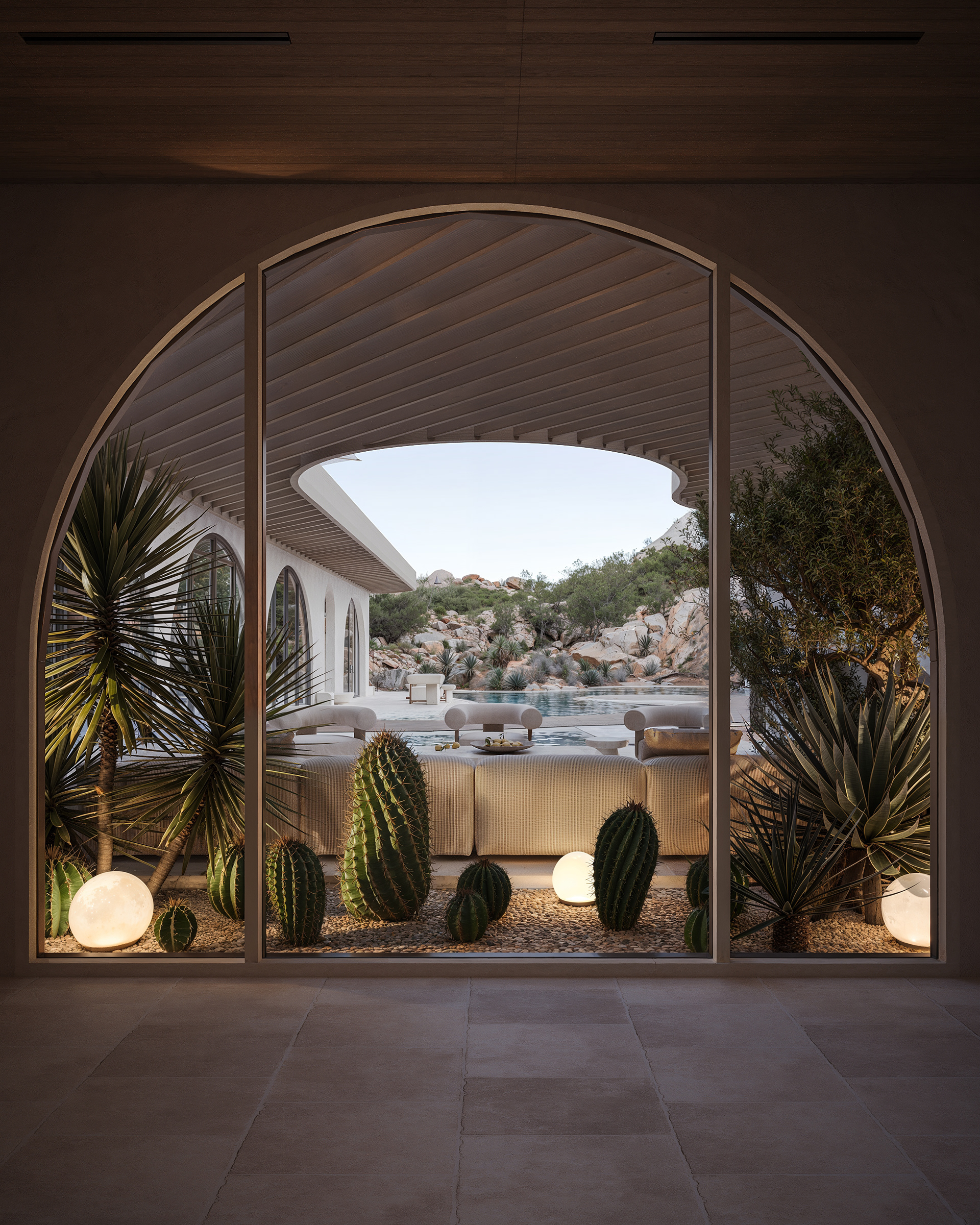 Arched windows create a seamless connection between the interior and the outdoors, filling the space with soft natural light. At the heart of the courtyard lies a lounge area with a pergola by the pool — a setting where architecture, landscape, and relaxation merge into one harmonious experience.