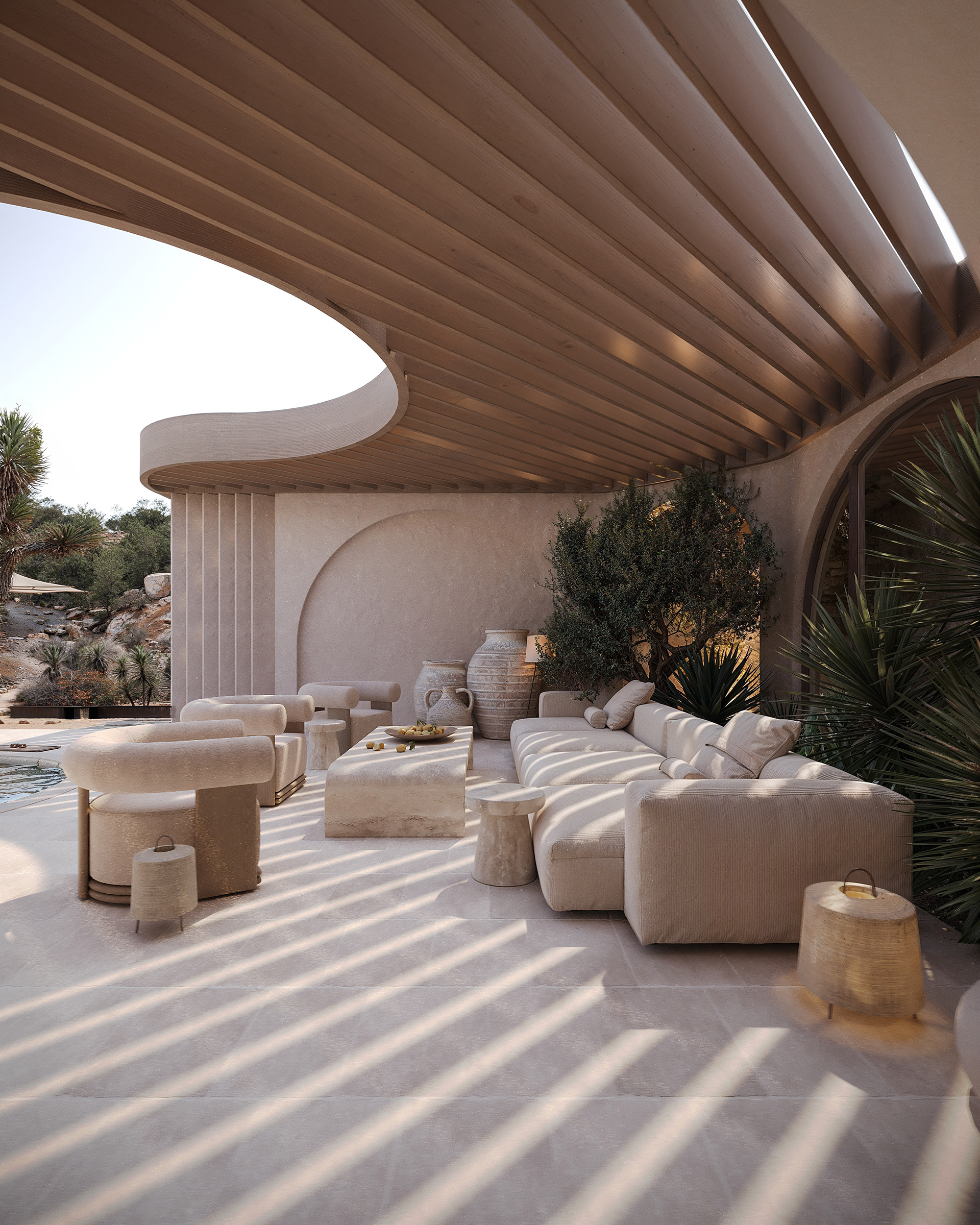 The shaded lounge area sits between the interior and exterior, forming a natural transition between the two. A blend of greenery, textured surfaces, and soft furniture shapes a serene, resort-like ambiance. The olive tree introduces a distinct Mediterranean character to the space. In the evening, warm ambient lighting and the glow from the pool transform the atmosphere — from calm relaxation to a subtly festive mood.