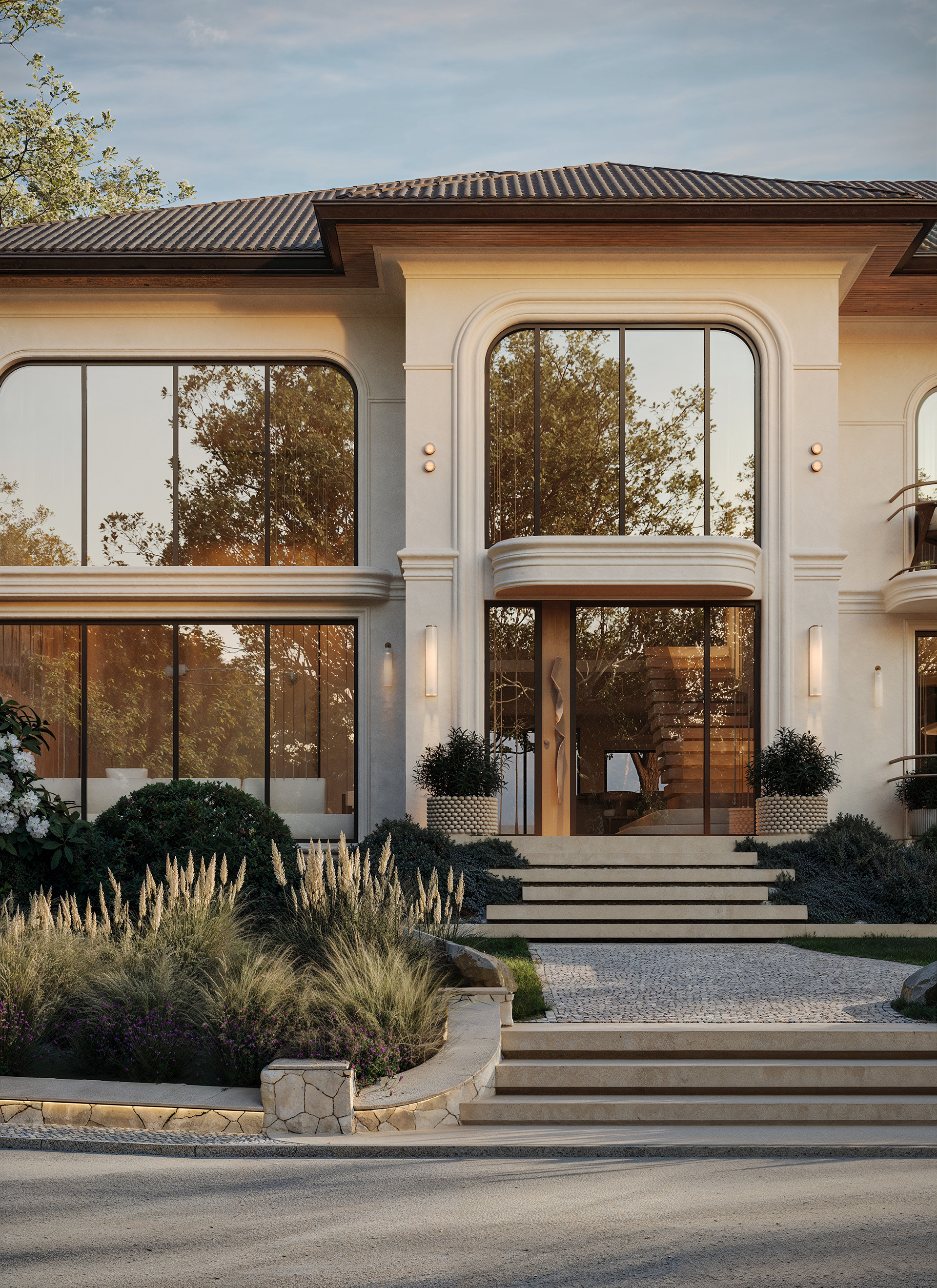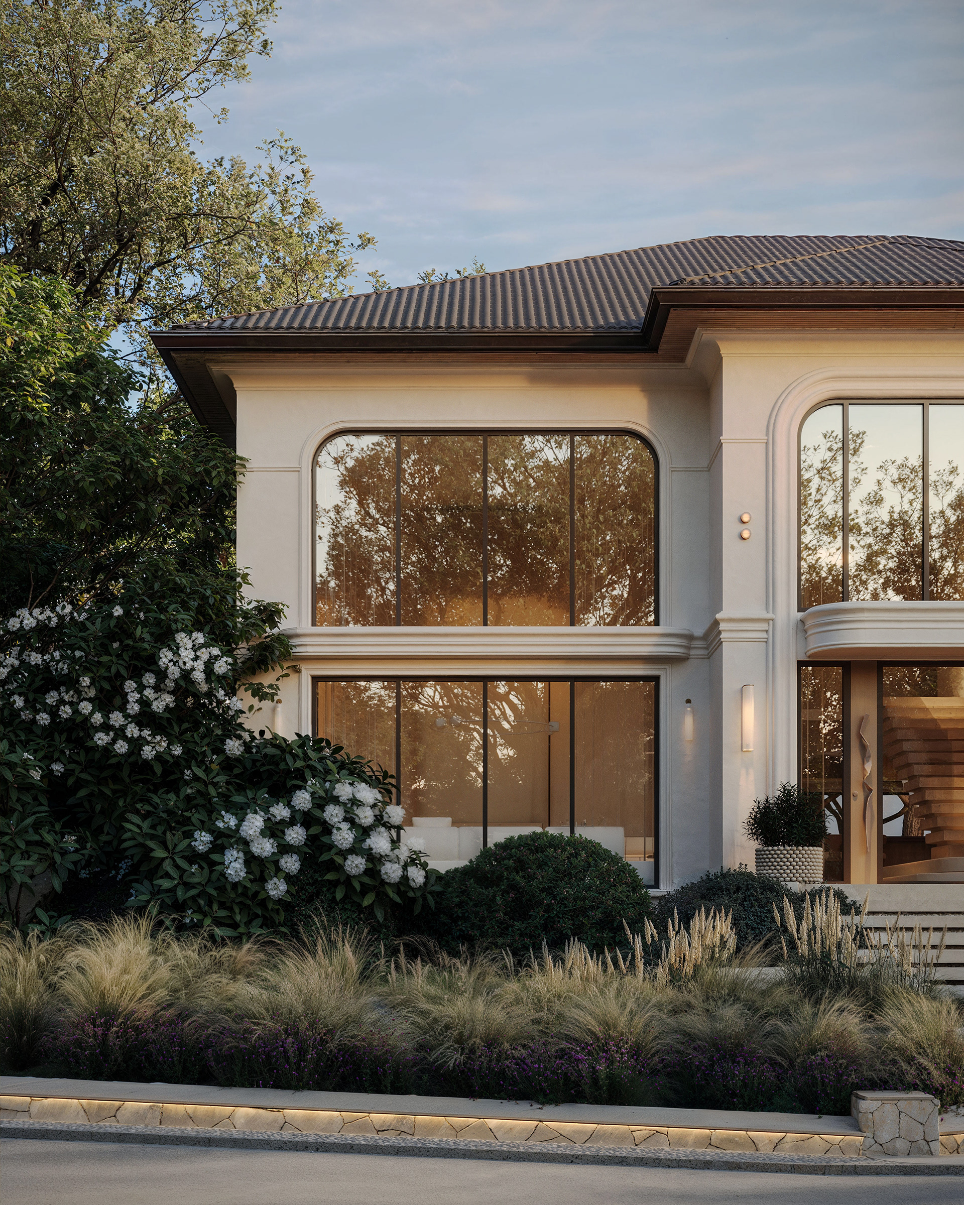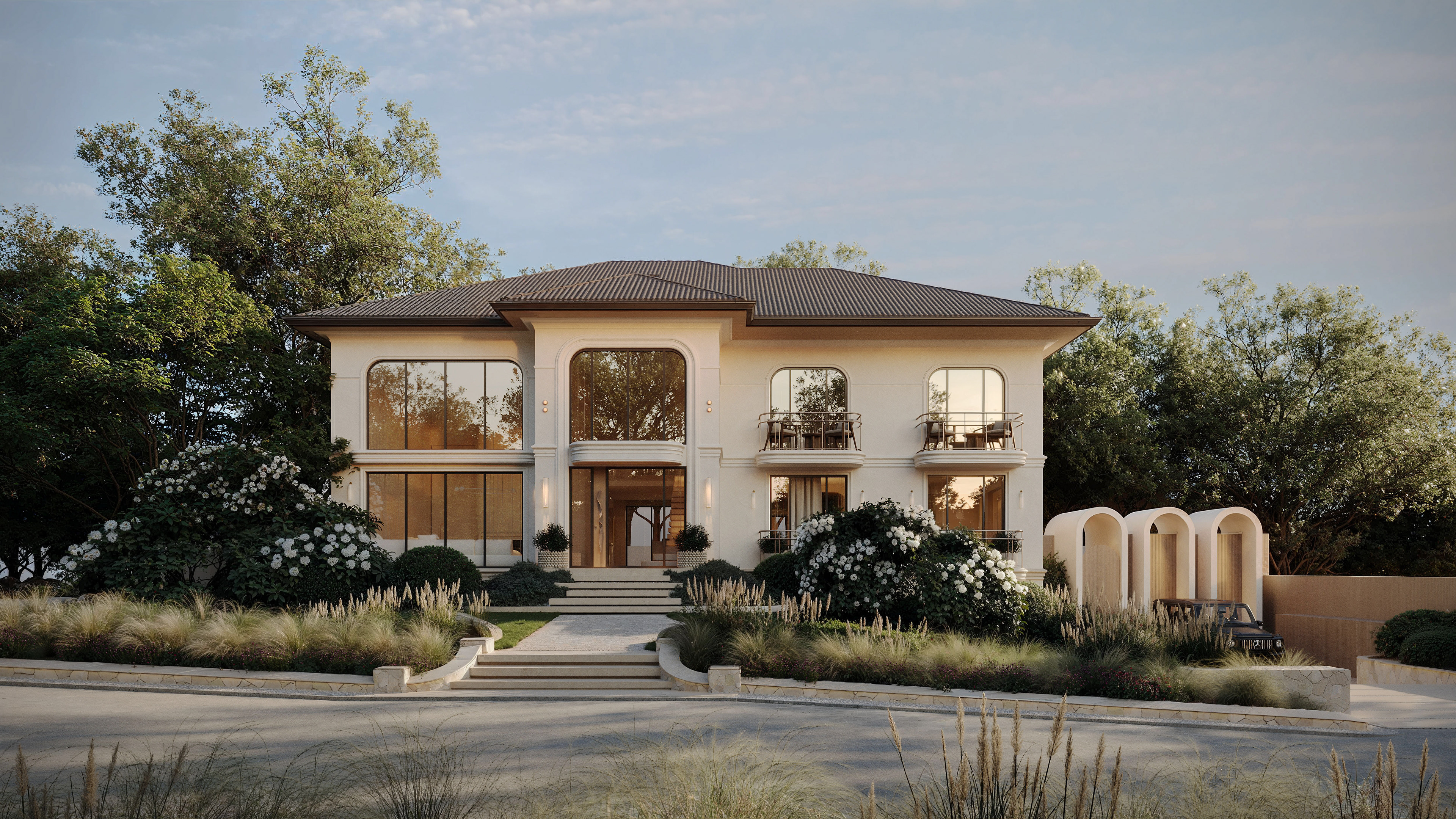 The house design in New York blends contemporary aesthetics with a sense of classical symmetry. Large arched windows establish a strong visual connection with the surrounding nature, filling the interior with warm daylight. The soft, layered landscape composition enhances privacy and serenity, giving the residence an elegant and welcoming presence from the very first sight.