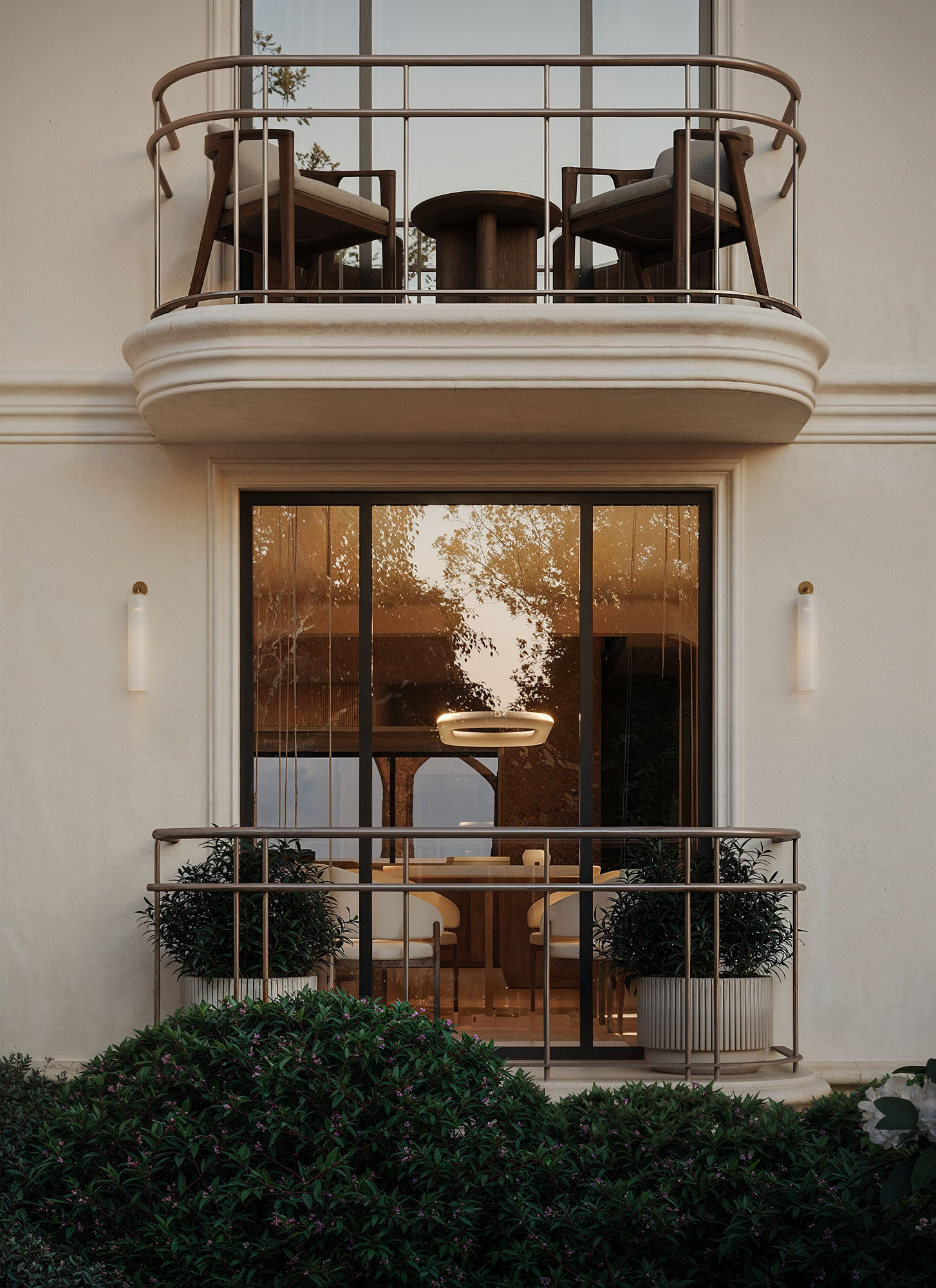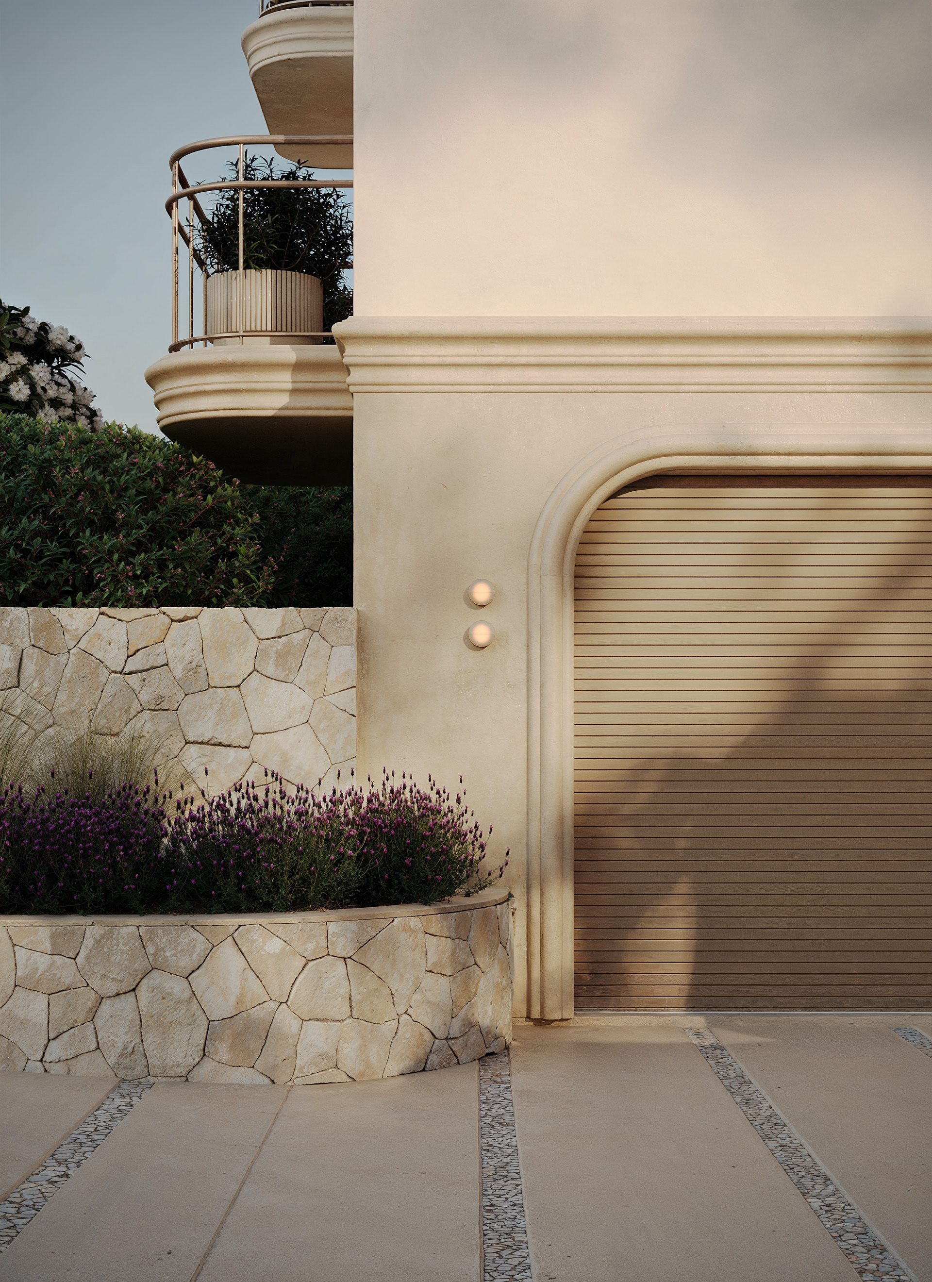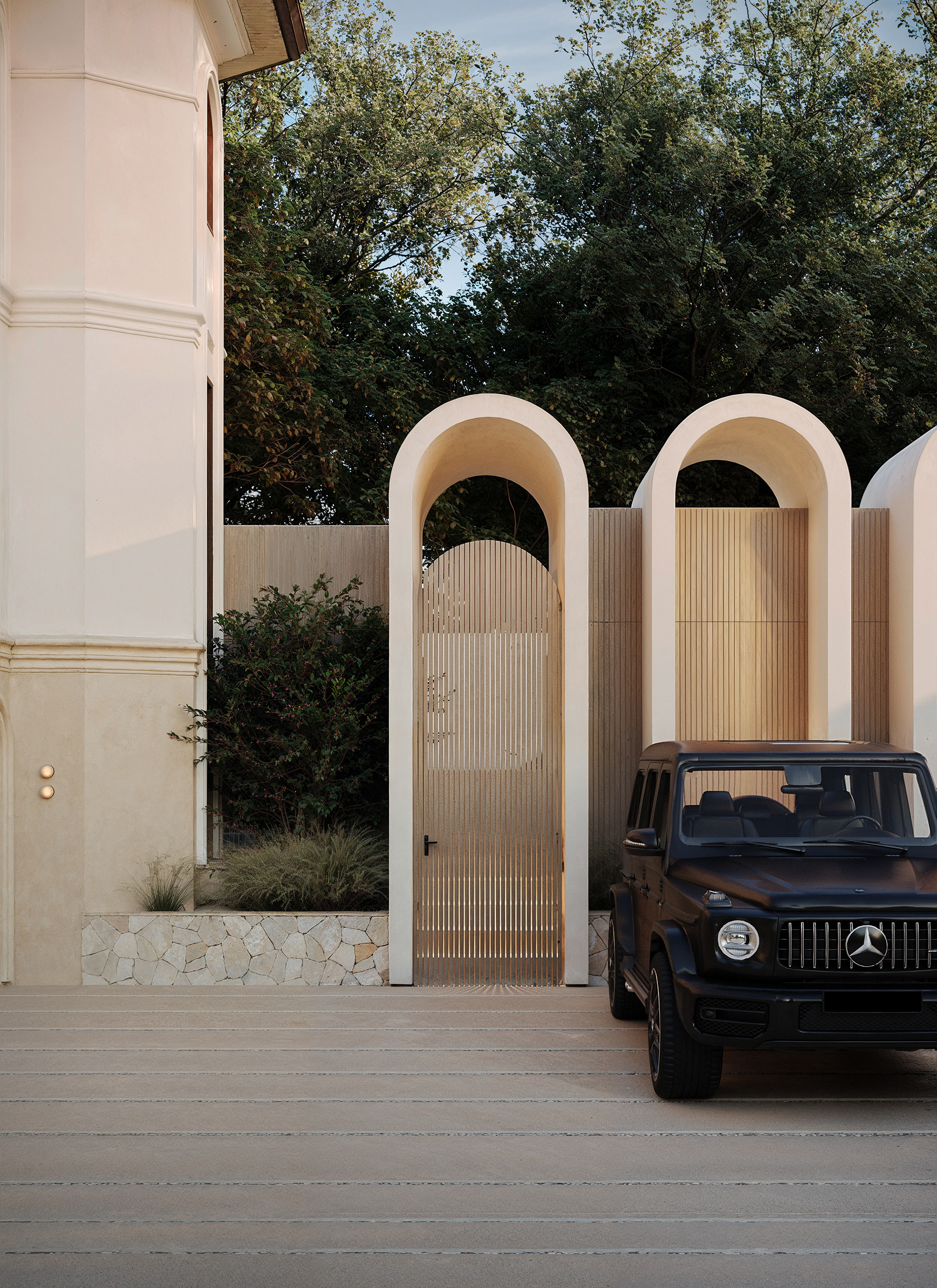 The house design in New York blends contemporary aesthetics with a sense of classical symmetry. Large arched windows establish a strong visual connection with the surrounding nature, filling the interior with warm daylight. The soft, layered landscape composition enhances privacy and serenity, giving the residence an elegant and welcoming presence from the very first sight.