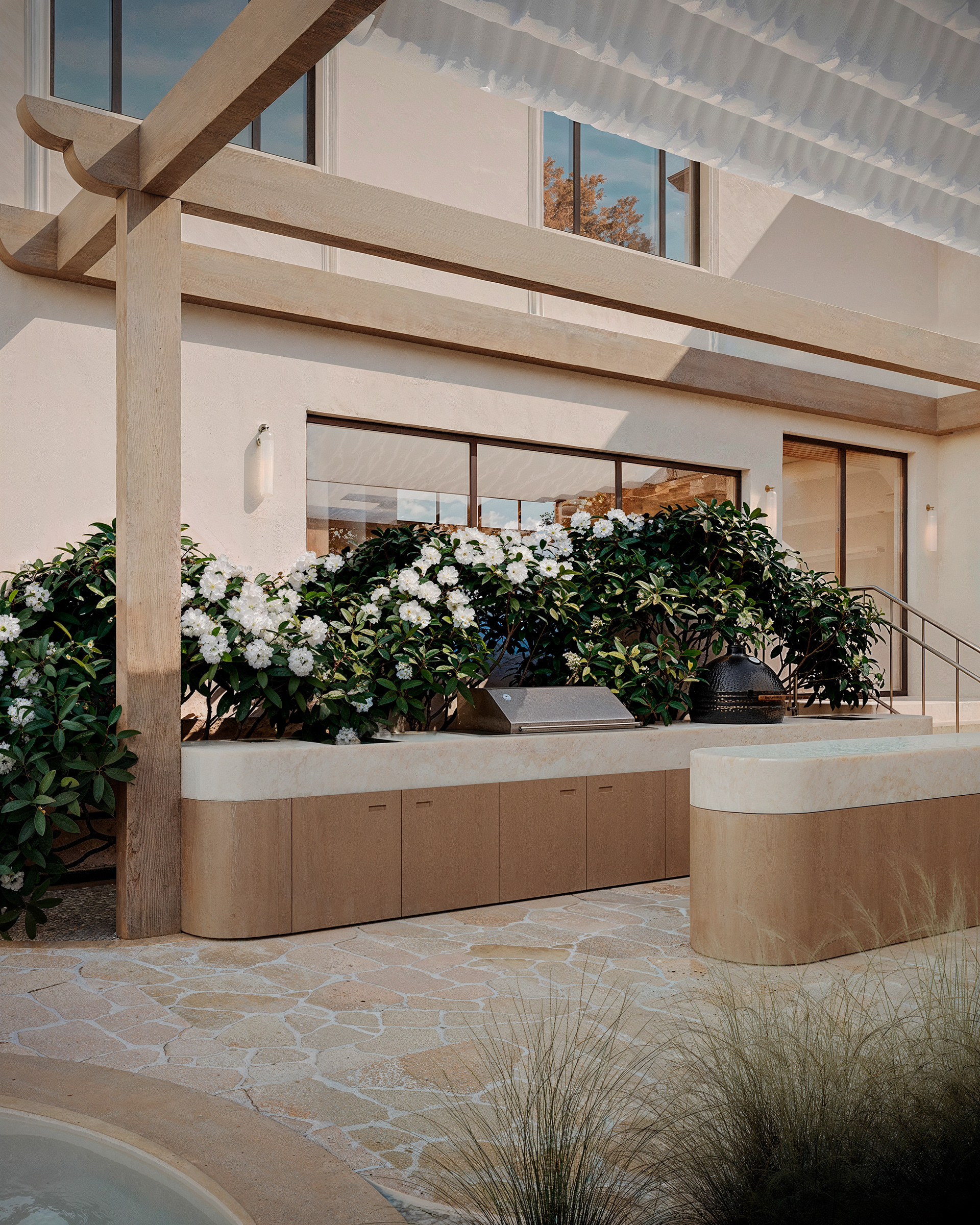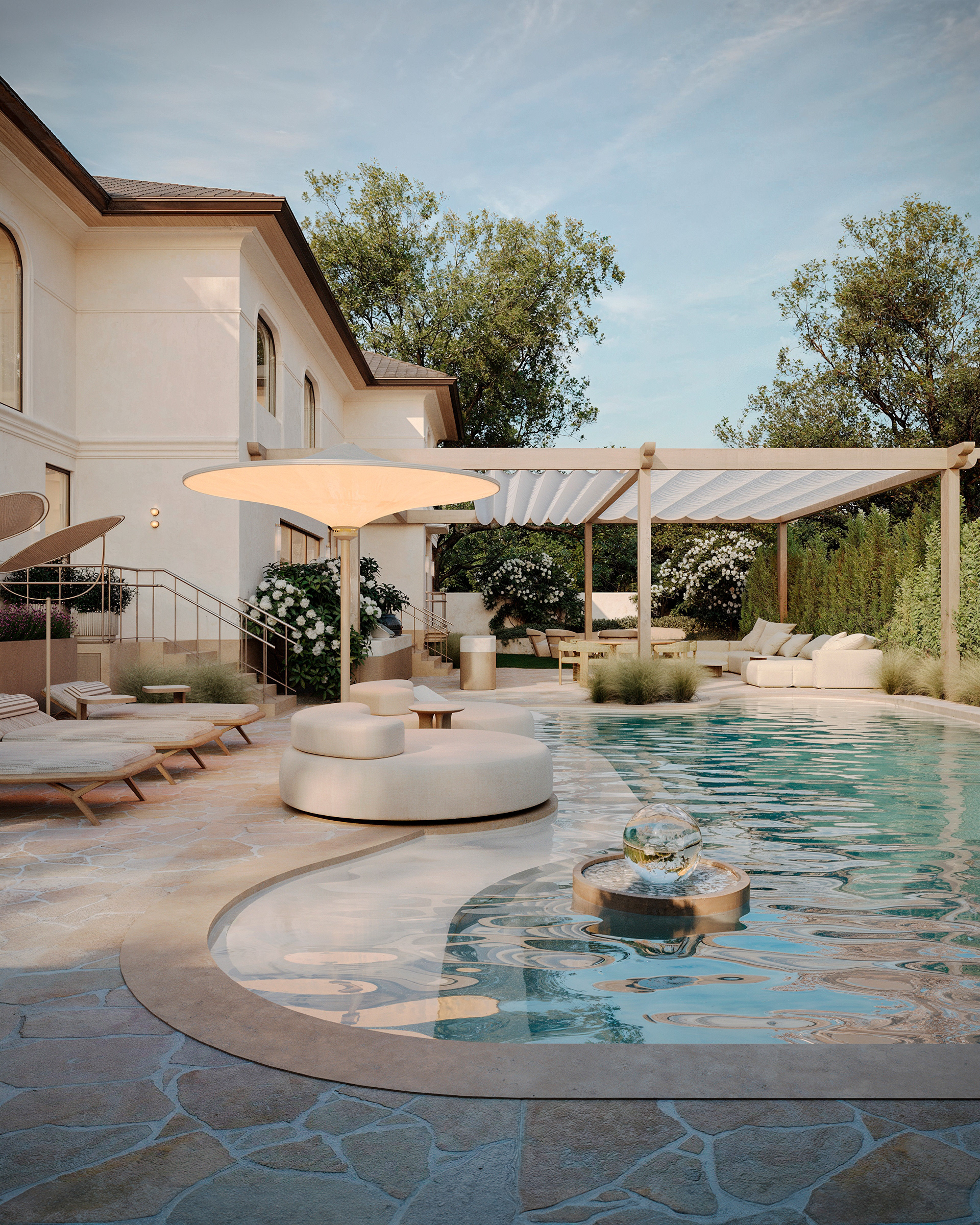 The inner courtyard is designed as a private oasis for relaxation. The organic pool shape blends with the soft lines of the landscape and furnishings, creating a serene outdoor retreat. Shaded lounge areas and carefully curated greenery provide comfort throughout the day, giving the space an intimate, resort-like ambiance.