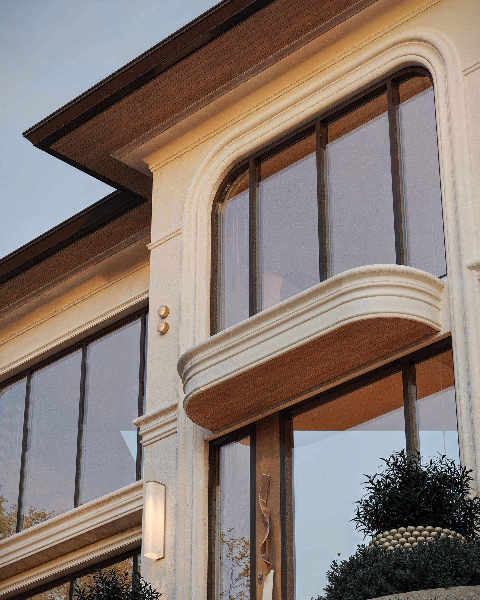 The facade details highlight the home’s refined architectural language: soft window radiuses, elegant profiles, and warm wooden soffits create a sophisticated, welcoming aesthetic. Carefully balanced proportions and materials ensure a contemporary look while preserving a touch of classic elegance. The surrounding landscape reinforces these forms, completing the residence’s harmonious appearance.