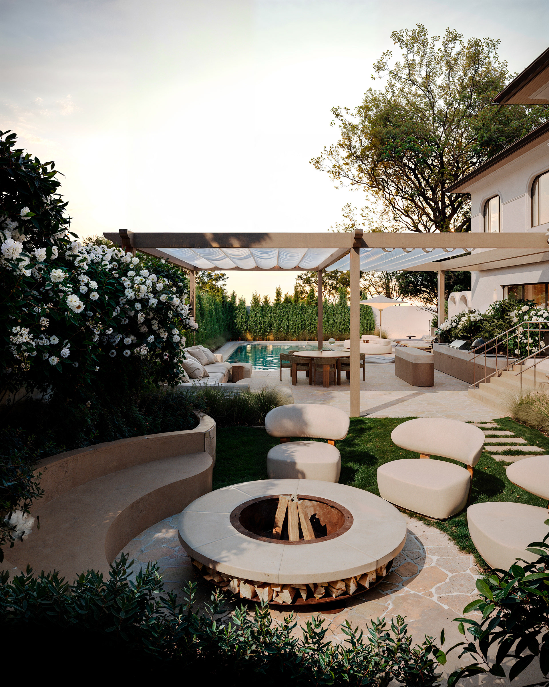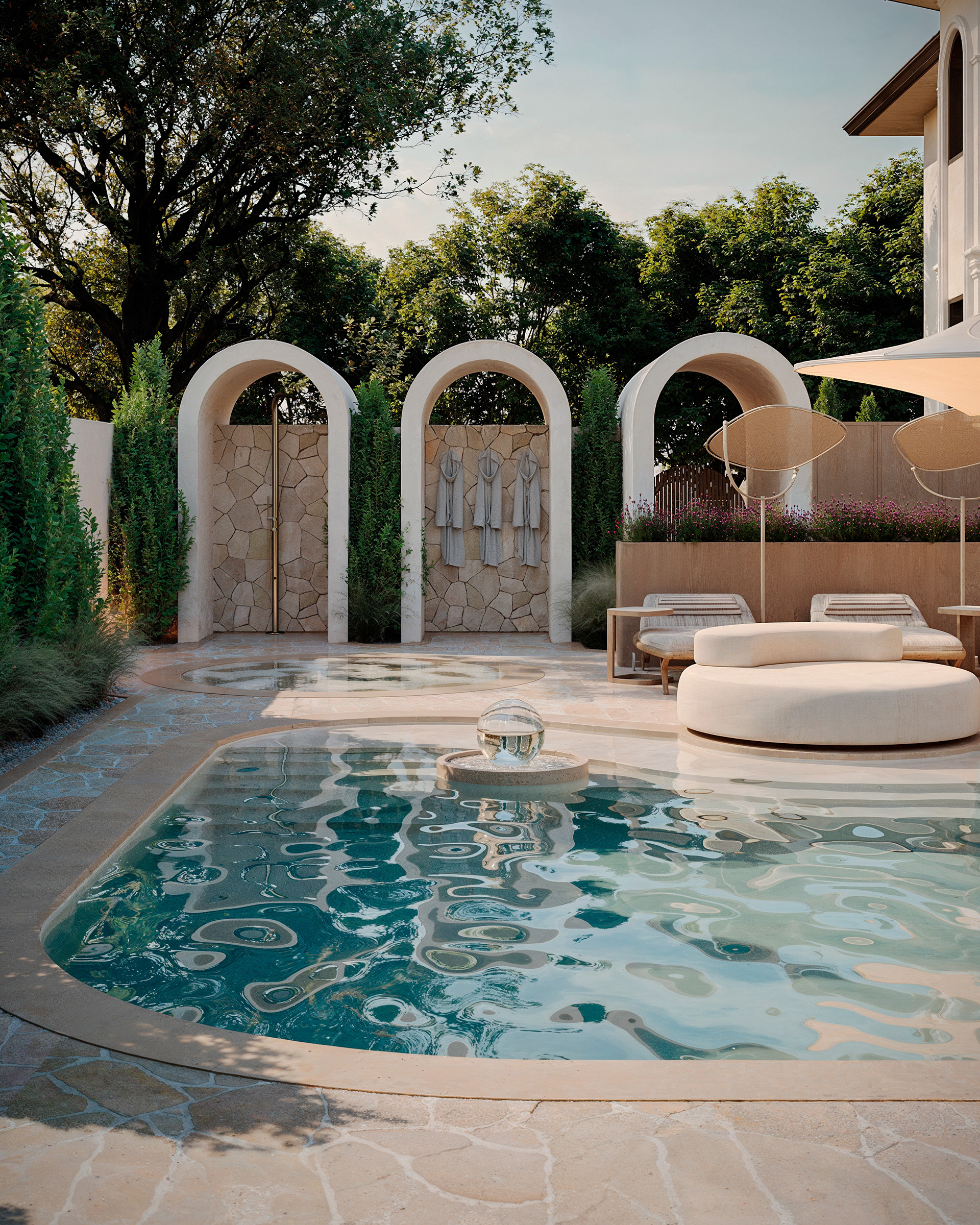 The inner courtyard and pool area are designed in a soft natural palette, where the organic water shape blends seamlessly with the arched architectural elements. A pergola provides a shaded lounge space, while the decorative arched wall introduces privacy and character. The curated planting and warm materials enhance the intimate, resort-like ambiance of the outdoor retreat.